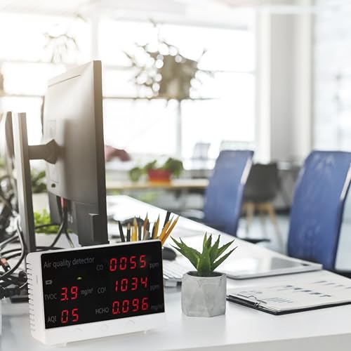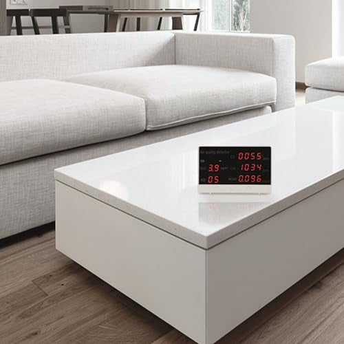 "Air quality monitor: Detects concentration of carbon dioxide (CO2), formaldehyde (HCHO), and volatile organic compounds (TVOC) in the air"