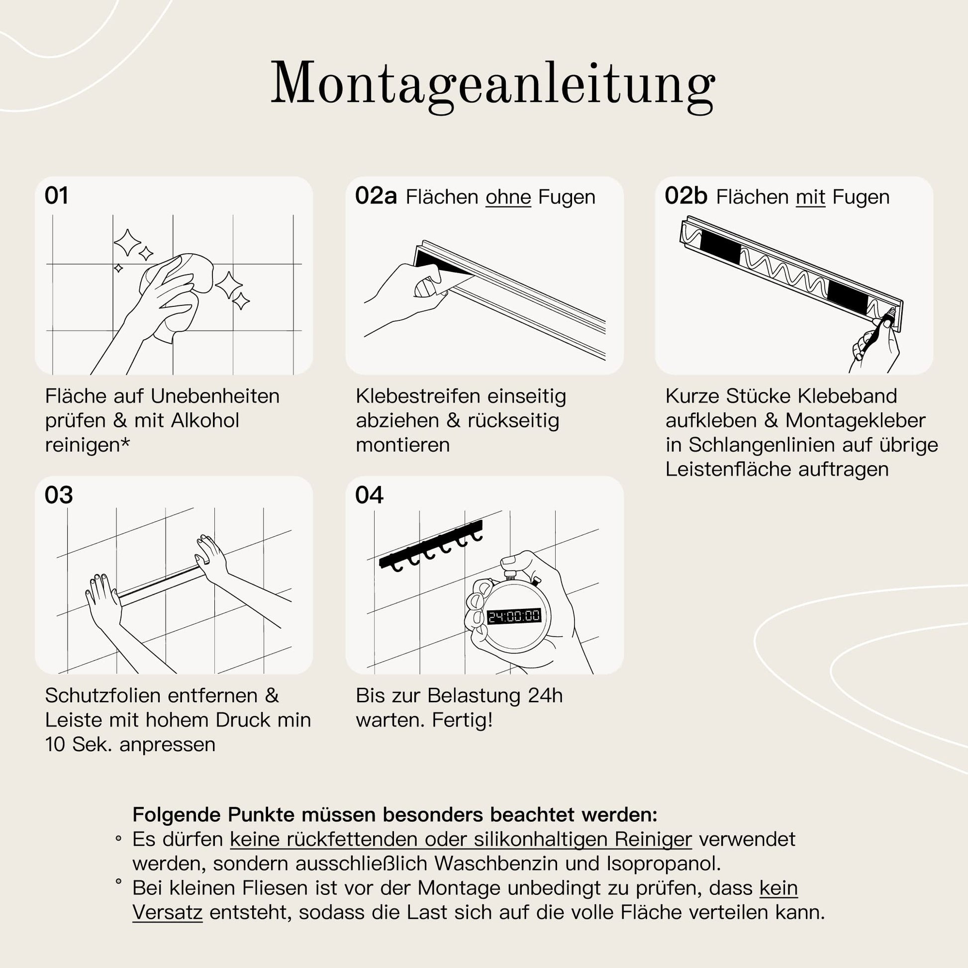 "☑️ UNIVERSAL USE BAR in kitchen, bathroom, on doors, or other surfaces. Easily mountable on any smooth and durable surface. Easily expandable with additional rails for a stylish overall look.",