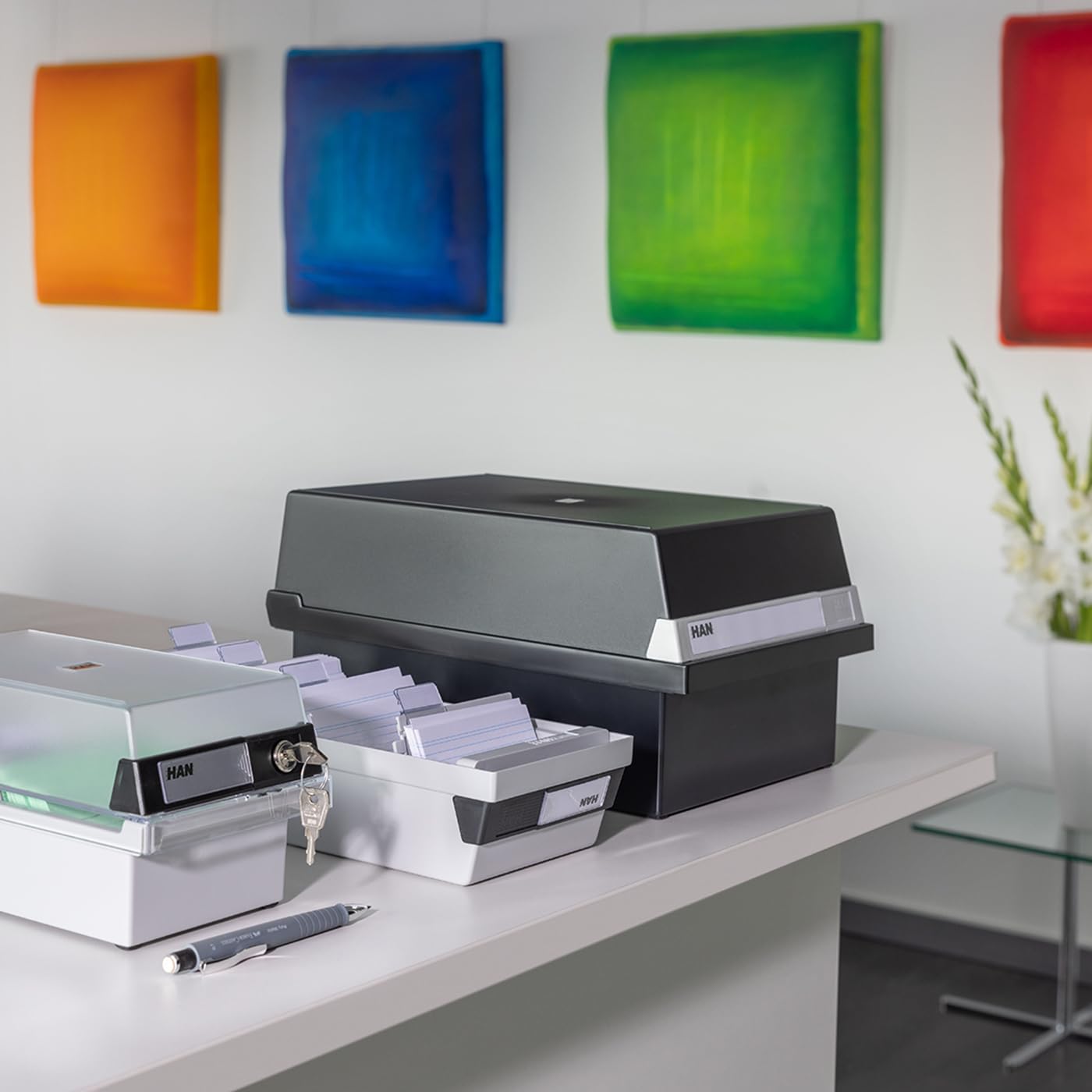 "Ordered with system. Simple and fast with the HAN index card box. Very high-quality execution. Particularly stable and proven. Expandable individually with additional support plates. Ideal for intelligent information processing in high-quality execution. The large labeling field allows for easy orientation. Practical additional function: The trough can be placed in the removable lid to save space during processing. The index card box has non-slip, furniture-protecting rubber feet that guarantee a secure stand. Includes 2 support plates and adjustable index markers. Scope of delivery: 1 x HAN 956-13, index card box DIN A6 landscape, with label field for 1,300 cards, 2 support plates (item no. 9026), index markers (item no. 9001) and removable lid. Original HAN brand product. Design protected. Dimensions (WxDxH): 177x360x140 mm. Color: black. MADE IN GERMANY: HAN is one of the leading German brand manufacturers of organizational solutions for office & home and has been producing for over 65 years, some still by hand, at its headquarters in Germany. By producing sustainably, acting and doing business, we create and secure jobs with fair wages and salaries. SUSTAINABLE AND ENVIRONMENTALLY FRIENDLY: Our products are environmentally friendly and 100% recyclable in accordance with ISO 14021. For the production of our wood products, we use 100% FSC-certified woods. This supports economically, socially, and ecologically sustainable forest management. In addition, the used paints are water-soluble and thus have a significantly higher environmental compatibility."