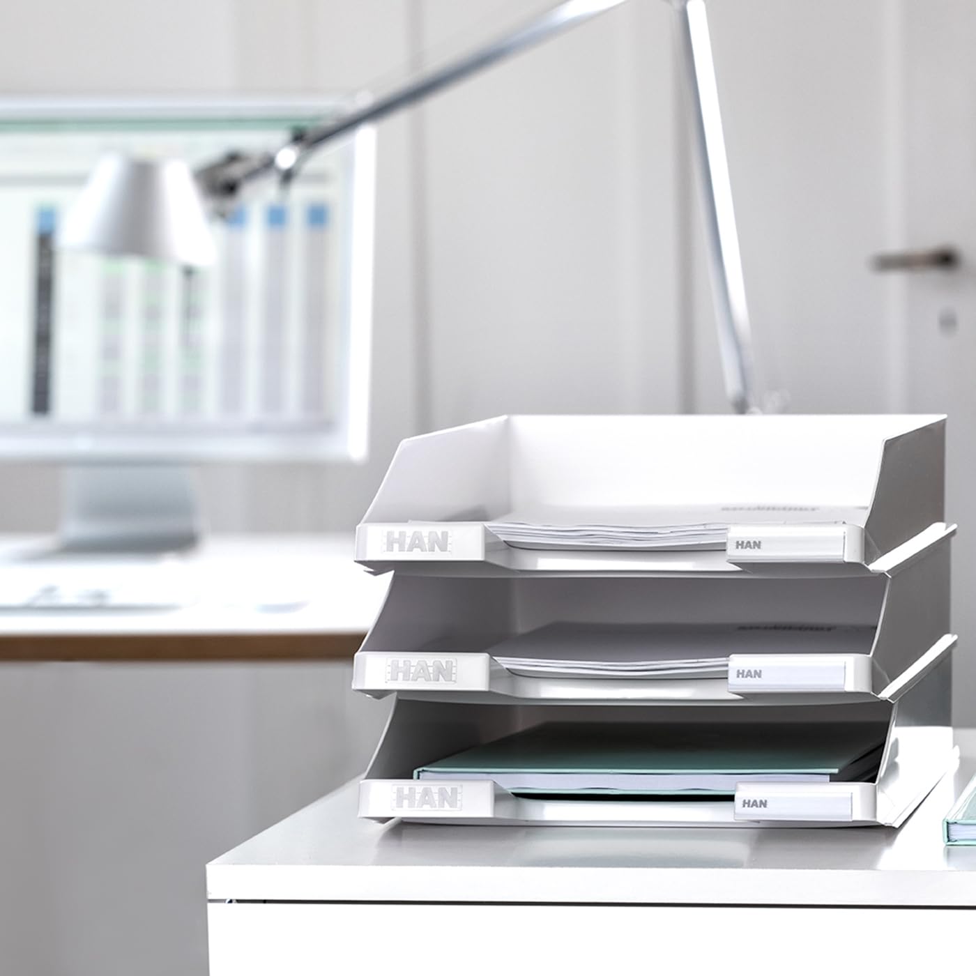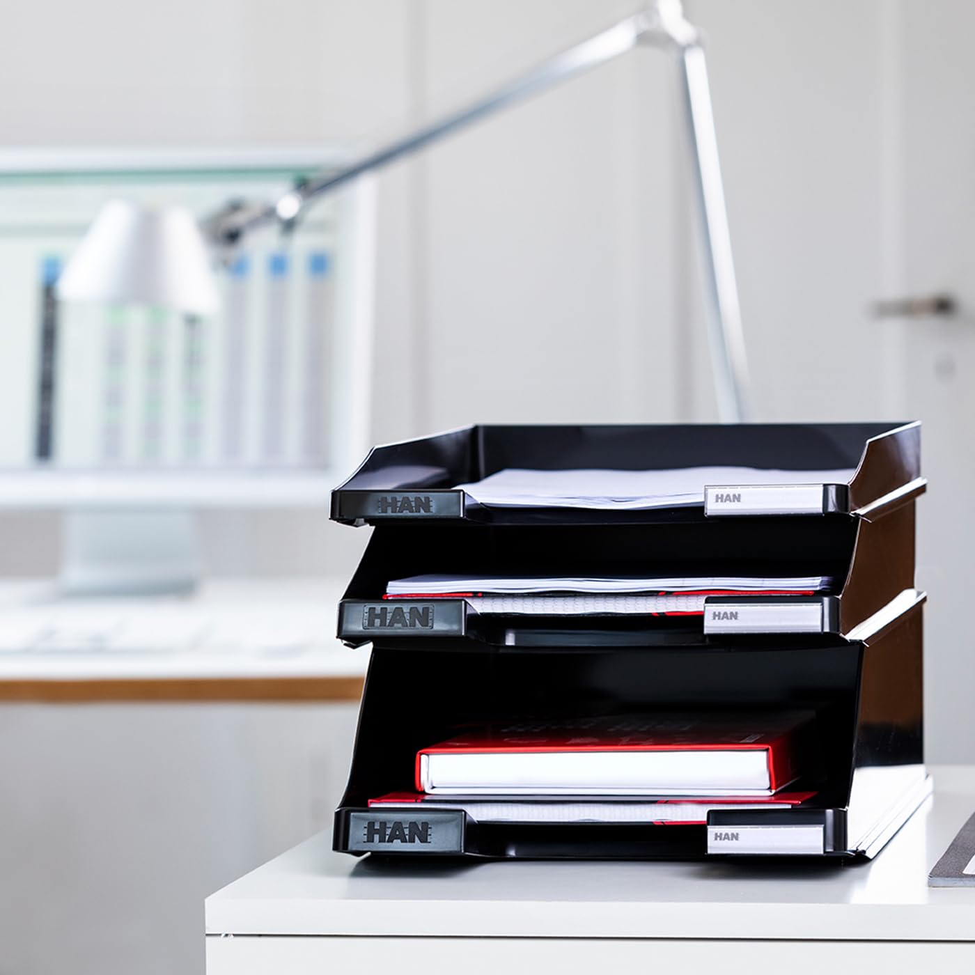 "The HAN Classic Letter Tray not only frees you from paper chaos and ensures order on your desk, but also with its classic design, it is a real eye-catcher in the modern office. Documents up to the size of DIN A4/C4 can be conveniently and clearly stored. The slightly slanted front prevents documents from slipping out. Space-saving filing system: The letter trays can be stacked vertically or staggered, forming the ideal organizational system for your desk or shelf. Compatible with all common letter trays. The wide handle cutout ensures easy orientation and optimal access to documents. Professionally labelable with optional labeling clips (Item No. 1021). Package contents: 10 HAN 1027-X-17 Classic Letter Trays, modern and stackable filing system in a fresh design up to DIN A4/C4 size. Original HAN branded product, design patent protected. External dimensions (WxDxH): 255x348x65 mm, color: red."