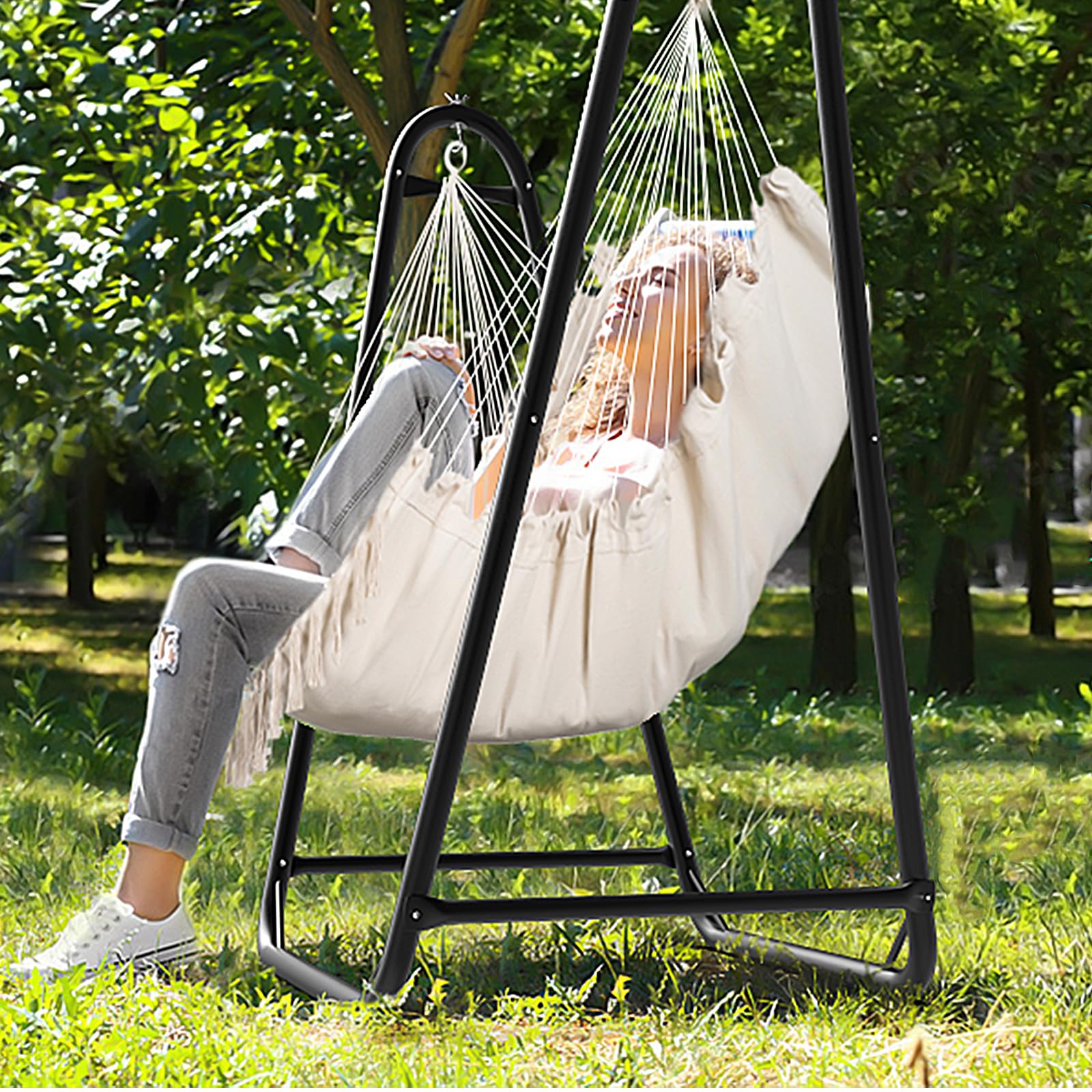 ["Unique Appearance Patent】New hanging chair with stand U-shaped structure, the bottom of the separately designed brackets increases the contact area with the ground, ensuring good balance, comfort, and stability at the same time. The barless design above the hanging chair with stand provides a wider field of view, promoting more peace and relaxation.","【Durable Material】Hanging chair with stand double tube design, load capacity of 350 pounds, stable swinging, powder coating for rust protection, withstands most weather conditions, great for indoor and outdoor use.","【Free Cotton Hanging Chair】The hanging chair with stand is suitable for most hanging chairs. We also offer a hanging chair made of natural long-staple cotton with excellent softness, durability, and comfort. The custom-designed side pocket provides space for items such as a phone, book, and iPad, making it very convenient and providing a more pleasant environment for relaxation and reading.","【Easy Installation】The hanging chair stand can be installed in just 10 minutes using the tools provided. A more suitable size allows you to enjoy the hammock stand anytime, anywhere.","【Customer Service】We strive to offer excellent outdoor swing stands and provide thoughtful after-sales care. I hope you have a good shopping experience and are always ready to solve your problems."]