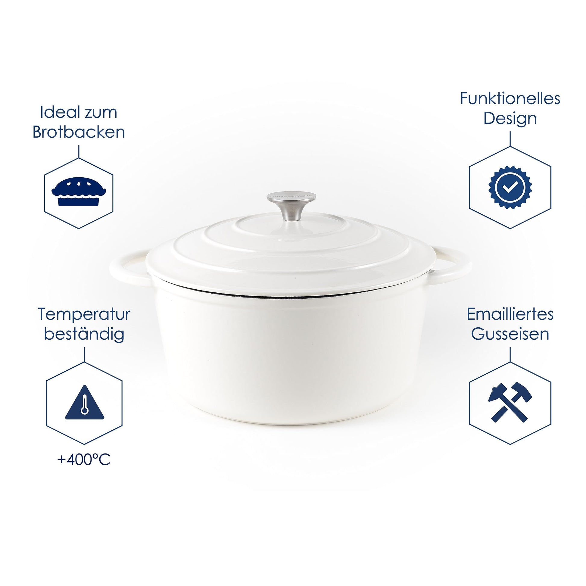 ["✅ ENERGY EFFICIENT HEAT DISTRIBUTION - Made of enameled cast iron, the heat is evenly and quickly distributed. The Hanseküche pot is temperature resistant up to 400 degrees.","✅ TRADITIONAL AND FUNCTIONAL DESIGN - The design of the Hanseküche pot is traditionally crafted and will visually enhance your kitchen and dining room. The cast iron regulates heat evenly, ensuring even cooking.","✅ INDUCTION COMPATIBLE - With its flat bottom and basic design, the Hanseküche pot is suitable for all stove and grill models as well as induction - in the kitchen and outdoors.","✅ EASY TO CLEAN AND DURABLE ENAMEL COATING - The Hanseküche pot is made of high-quality materials. Made of enameled cast iron inside and out in combination with the innovative construction structure ensures a long lifespan. Cleaning is also easy and residues can be easily removed from the cast iron.","✅ COMPREHENSIVE & FAST CUSTOMER SERVICE - We are here for you! Your satisfaction is our top priority. We want to make sure you are 100% satisfied with your purchase. If you have any questions or issues with your order or your Hanseküche pot, please contact us immediately. We will address your concerns promptly and personally."]
