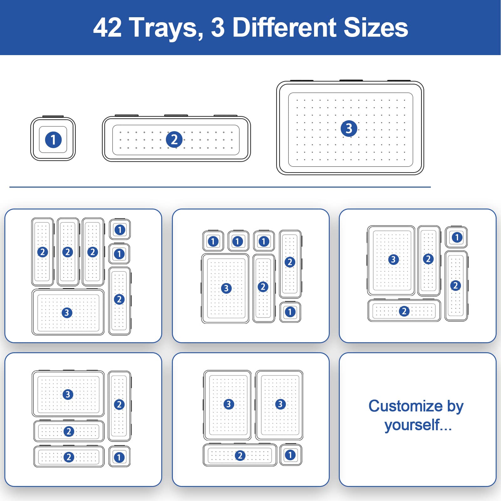 ["Drawer Organizer: These flat desk drawer organizers keep your accessories neat, tidy, and organized. Perfect drawer inserts for office drawers, toolboxes, makeup drawer organizers, kitchen drawer organizers, bathroom drawer organizers, ideal for bathrooms, office supplies, cosmetics or vanity tables to organize hair accessories, school supplies, or tool accessories.","Interlocking and stackable: The design can help you organize and create your own style to fit in drawers. You can use them separately or mix and match, interlock in any arrangement that works for you, fully customizable. The free double-sided tape is the perfect solution for the problem of easily sitting together but not staying together. Simply stick it to the bottom of the plastic trays for slip resistance.","Durable and easy to clean: Made of high quality, solid, and durable plastic and molded with rounded corners. Only requires a damp, warm soapy sponge or cloth for quick and effortless cleaning. Storage and organizer trays are perfect for professional mechanics, technicians, electricians, woodworkers, and artists.","42 pieces and 3 sizes, 42 pieces, flexible small drawer organizers with 3 different sizes allowing for a variety of layouts. Items are organized by size and usage, includes 24 pieces, size S: 7.5cm, 7.5cm, 4.5cm, 12 pieces, size M: (9.2cm, 2.9cm, 4.6cm) - 69.5cm, 4.5cm, 6 pieces large: (9.2cm, 6cm, 4.6cm) - 23.5cm, 15.5cm, 4.5cm","International products have separate terms, are sold from abroad, and may differ from local products, including fit, age ratings, and language of product, labeling, or instructions