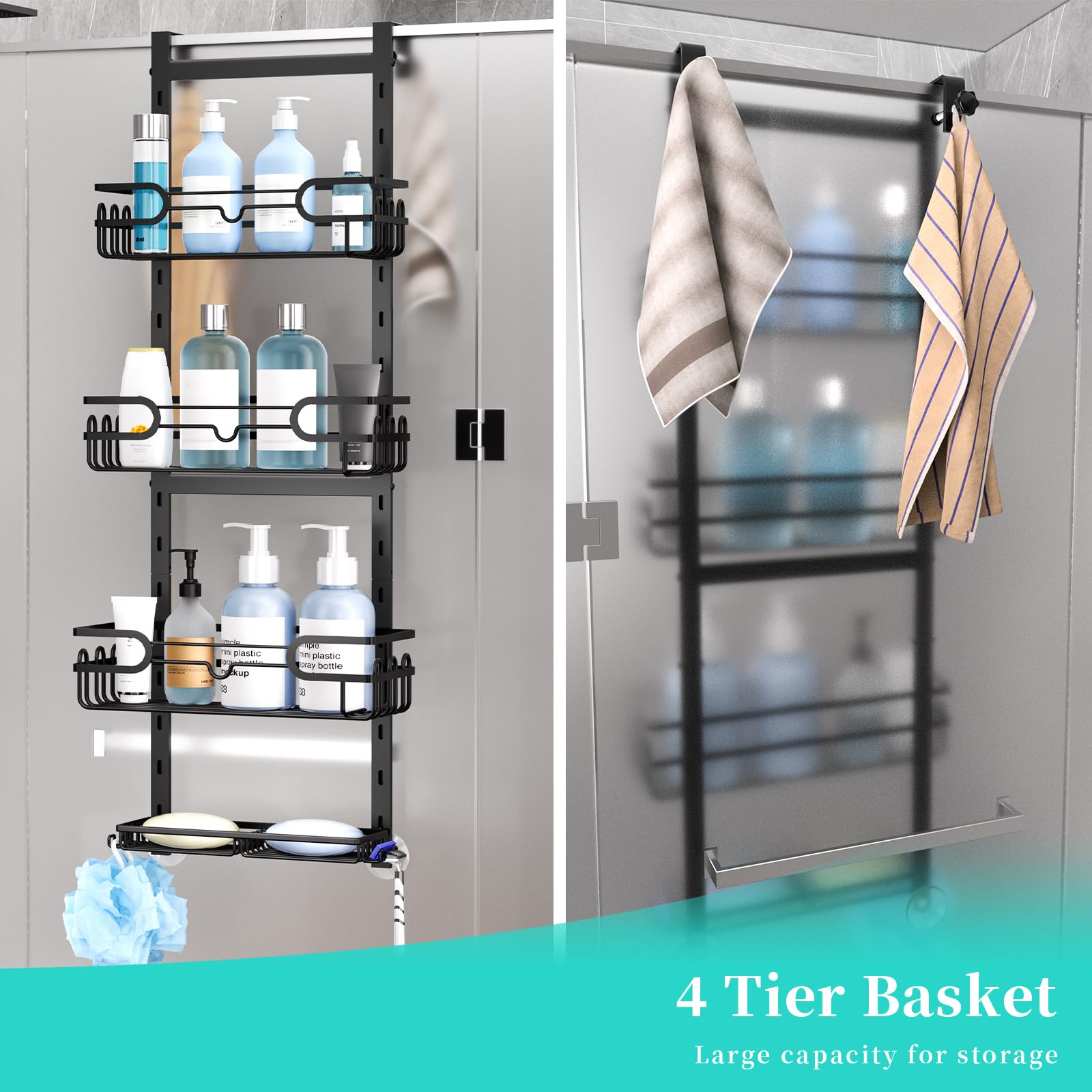 ["Hanging Shower Caddy Effective Storage]: Hanging shower caddy helps you save space effectively. A 4-tier hanging shower caddy with soap dish and hooks facilitates the storage of bathroom items such as shampoo, shower gel, bath bombs, can carry up to 40 pounds.","[Note]: Shower caddy for hanging is suitable for use on bathroom doors with a thickness of up to 1.89 inches, please measure the corresponding shower hanging bracket size before purchasing. Hanging shower caddy without drilling is not suitable for shower sliding doors","[Adjustable Hanging Shower Organizer Bracket]: Black hanging shower caddy is equipped with special holes on both sides, you can adjust the height of the shower shelf without drilling flexibly as needed, hanging shower shelf It brings you great convenience","[Hanging Shower Caddy Adjustable to Different Door Sizes]: Black hanging shower caddy comes with adjustable threads on top, you can install it behind the door and adjust the width freely to fit different thickness hanging shower rack and size of the door","[Shower Wall Shelf Sturdy Stable]: Shower caddy with two strong suction cups on the bottom, makes the shower caddy more stable. You don't have to worry about the shampoo holder for shower falling off or wobbling","[Rustproof Hanging Shower Shelf]: Black shower caddy is made of high-quality stainless steel, the surface is treated with a spray process, hanging shower shelf that can be used for a long time without rust formation","[Draining Hanging Shower Caddy]: The hollow design of the shower caddy without drilling can accelerate drainage and keep it dry, say goodbye to the damp environment","[Easy Assembly Hanging Shower Shelf]: Shower storage for hanging installation shower gel holder without drilling is very easy, All you need to do is follow the steps in the manual. Snap the suction cups and the shower shelf into the small holes, hanging hanging black shower caddy on the door","[Professional Team]: You will receive a black shower caddy. If you have any questions during the process of using the shower caddy without drilling black, don't worry, we are here to help","Note: As the weather gets colder, this may affect the stickiness of the adhesive. Therefore, before use, use a hairdryer to blow warm air on the adhesive so it can adhere better"]