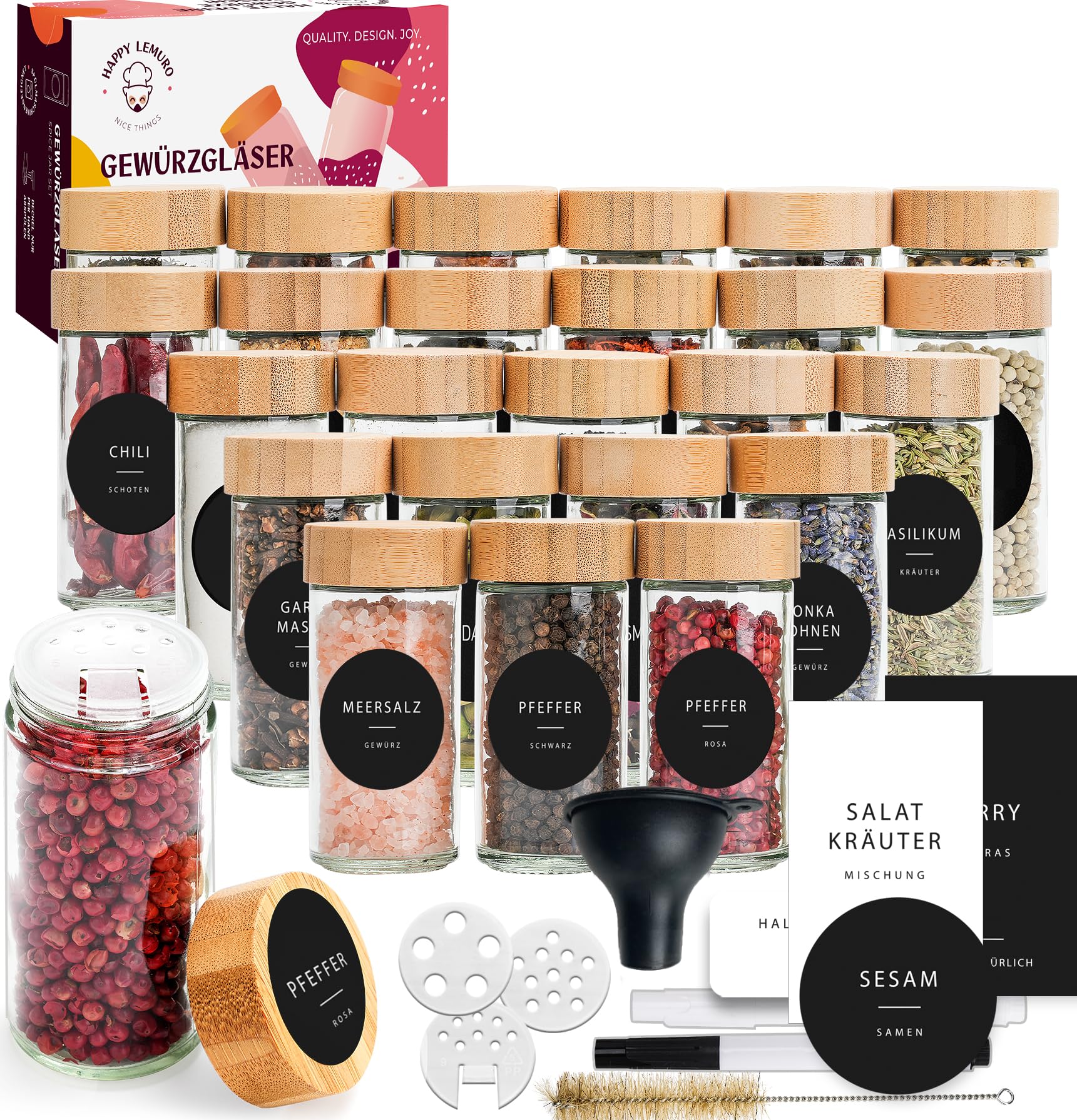 Happy Lemuro Spice Jars Round [24 x 100 ml] 435 Labels in German | Spice Containers with Wooden Lids & Accessories - Airtight - Set of 24 Spice Jars, Spice Storage Jars.