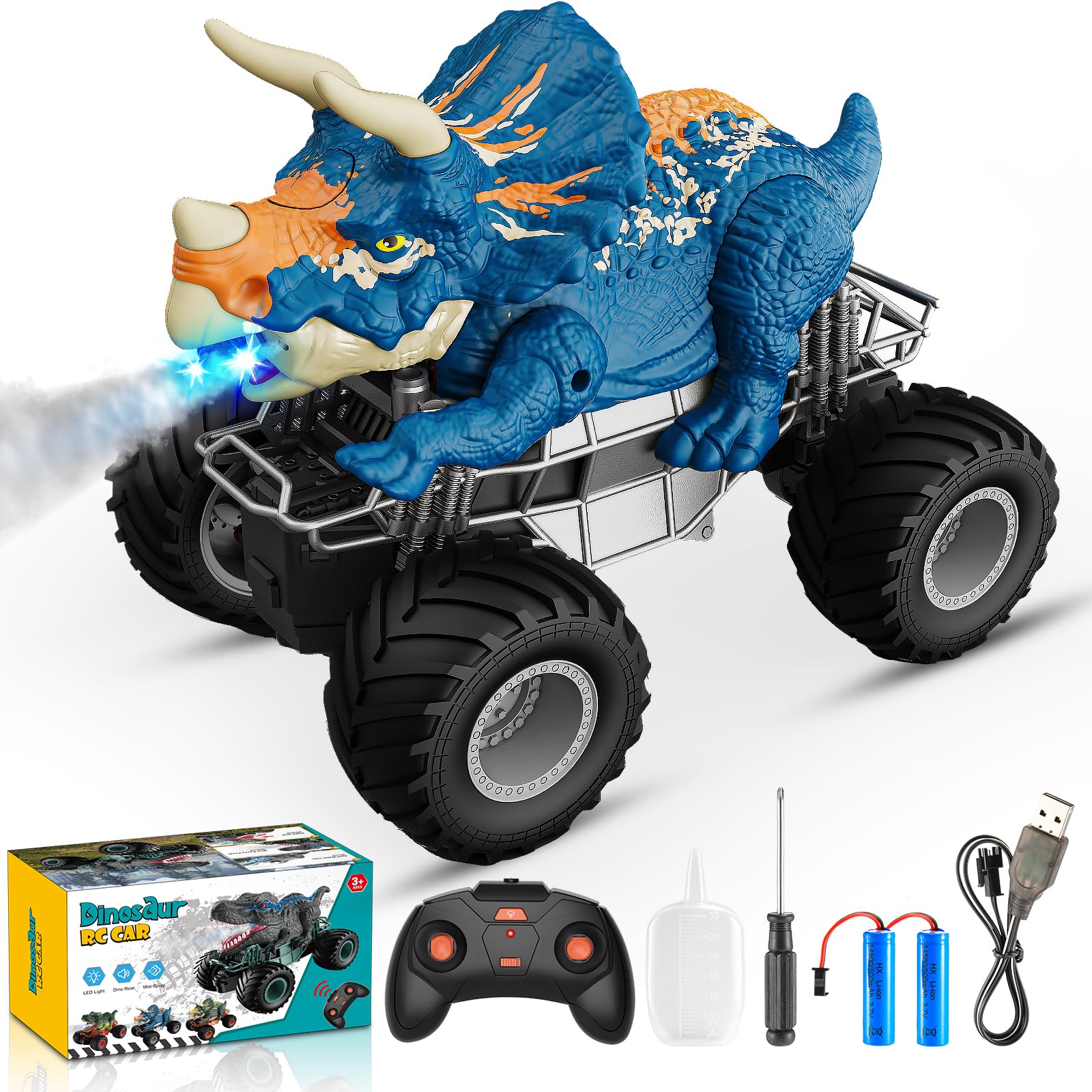 ["LED LIGHTS, DINOSAUR SOUNDS & SPRAY -- This RC dinosaur car toy not only drives forward/backward and turns right/left like a real car, it also has cool dinosaur LED blue lights and roaring noises and sprays like a dinosaur spitting "flames". It looks even more impressive! Simply fill the dinosaur head with water and press the spray button on the remote control.","LASTING STANDBY 60 MINUTES & USB CHARGING -- Equipped with 2 rechargeable high-capacity batteries for the RC dinosaur car toy, the running time is extended to 60 minutes (30 minutes per battery). The batteries support a variety of charging methods: computer, mobile power supply, sockets, etc. Charging time is approximately 3 hours per battery with a USB charging cable. The remote control requires 2x1.5V AA batteries (not included).","2.4GHz ANTI-INTERFERENCE CONTROL -- The high-speed RC toy car at 10KMH uses an interference-free 2.4GHz control frequency, allowing multiple RC dinosaur cars for children aged 4-12 to drive together at a distance of approximately 50 feet at the same time and in the same place. More outdoor fun for multiple players.","CONQUER ALL TERRAINS -- Powered by a powerful motor and equipped with flexible, non-slip rubber tires, this 2.4GHz RC dinosaur car toy is ready for adventures on all terrains like grass, sand, or concrete roads. Children can play outdoors on a variety of complex terrains such as beaches, gardens, parks, and more.","SAFE & FUN GIFT-- This ATV is made of ABS plastic and non-toxic, explosion-proof PVC material, very safe and reliable. Our RC car comes in a nice colorful box, perfect gift for birthday, party, Children's Day, Christmas, Halloween, and New Year. You can contact us if you have any questions."]