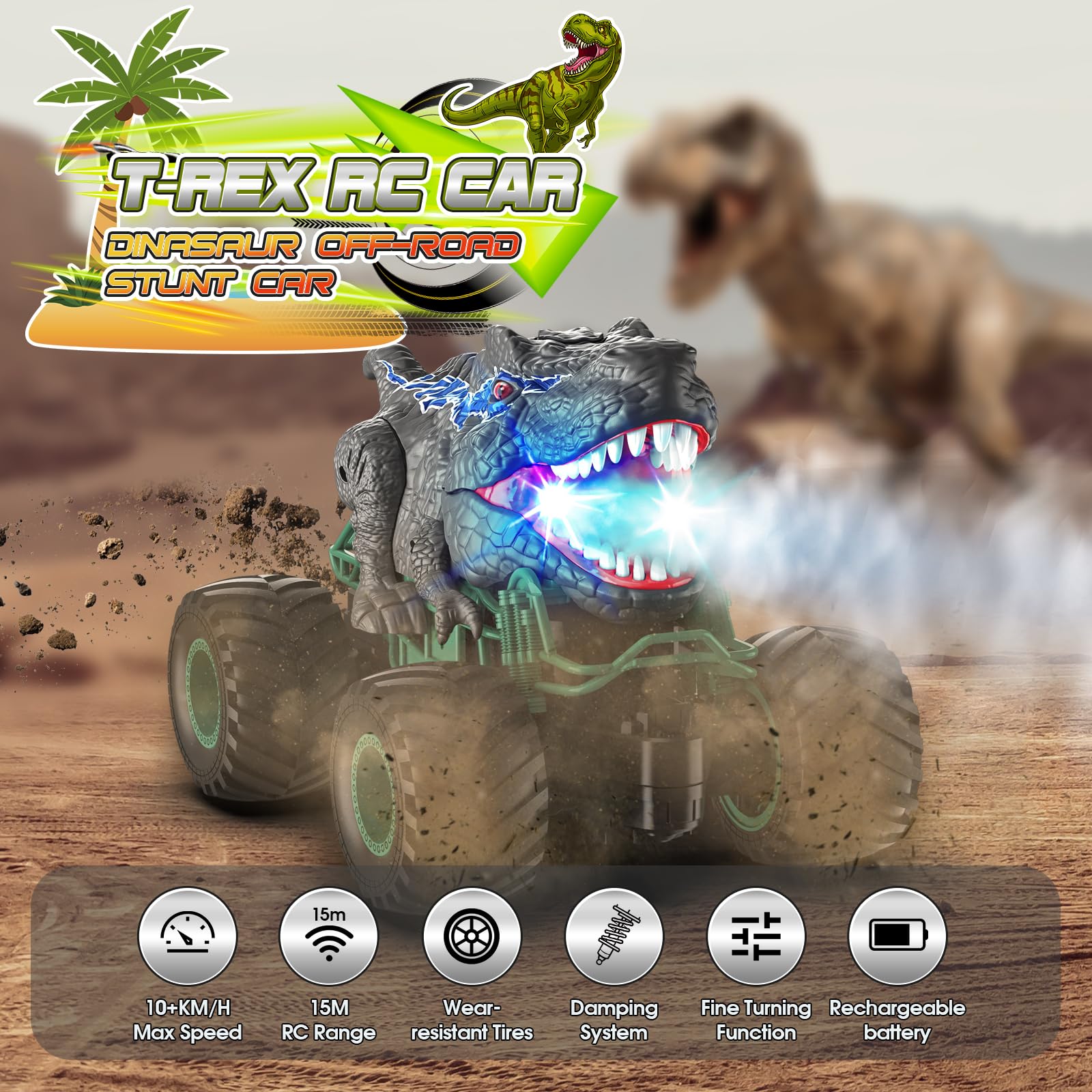 ["🌋LED LIGHTS, DINOSAUR SOUNDS & SPRAY -- This RC dinosaur car toy not only moves forward/backward and turns right/left like a real car, it also has cool dinosaur LED blue lights and roaring sounds, and sprays like a dinosaur spitting \"flames.\" It looks even more impressive! Just fill the dinosaur's head with water and press the spray button on the remote control.",