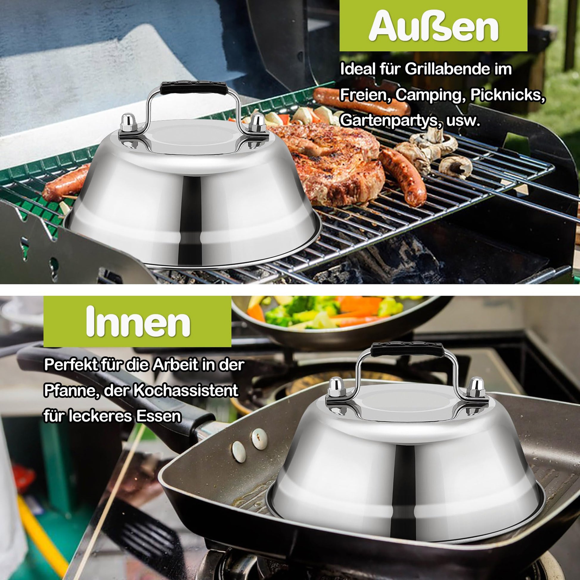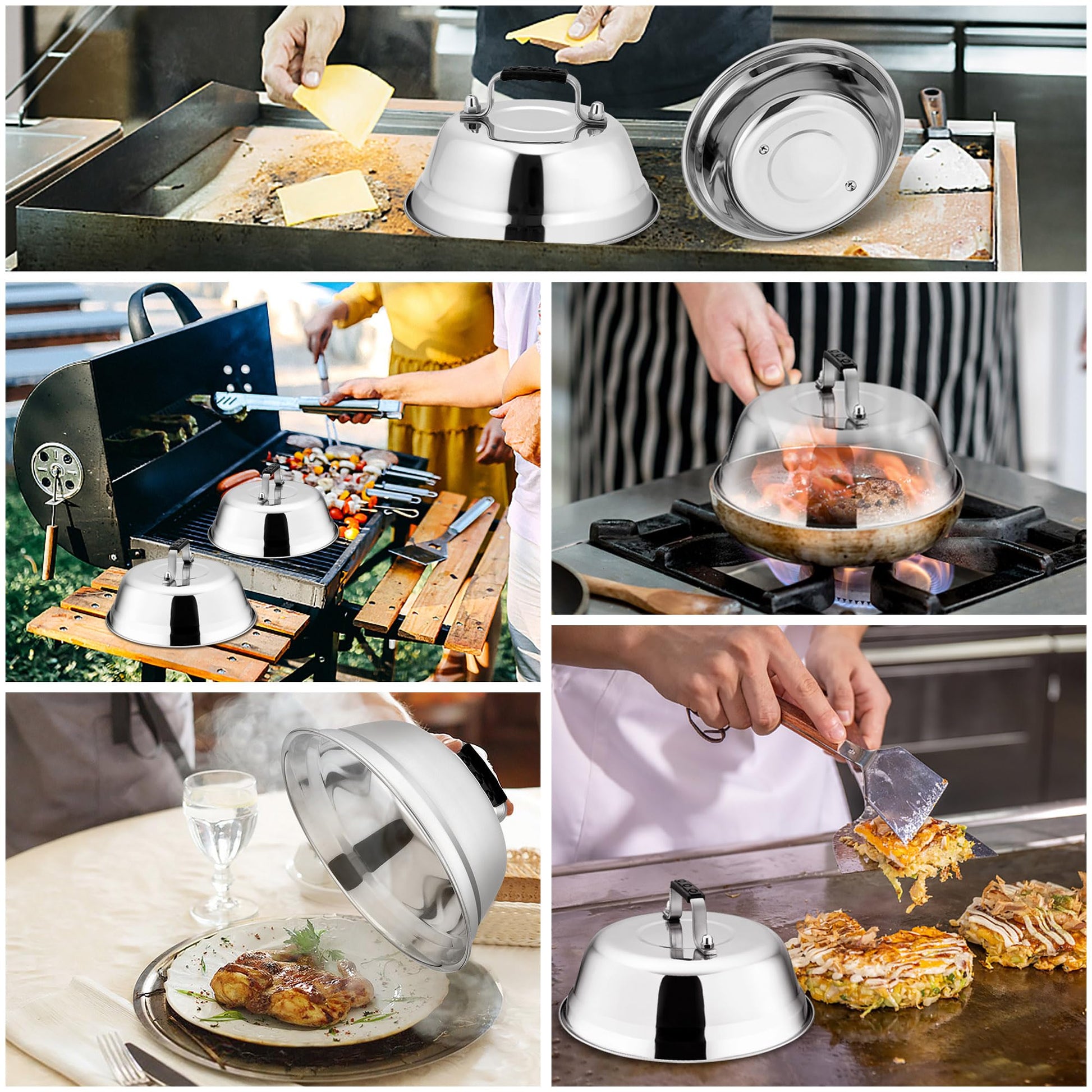 Efficient Cooking - The burger bell creates an oven-like environment where heat can circulate evenly inside, allowing cheese to melt quickly, preventing patty from burning and creating juicy cheeseburgers, Shortening cooking time effectively, Leaving behind hot oil splashes in the past, keeping heat until serving and avoiding stains.