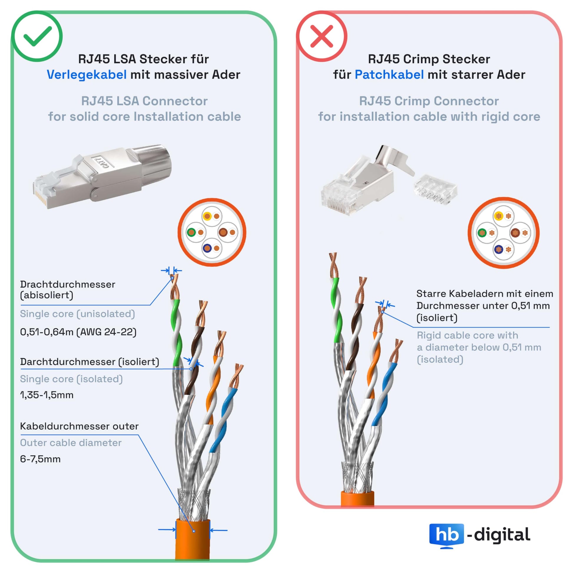 Wide compatibility and flexible application: The connector is suitable for solid and flexible network cables (AWG 22-24), supports both TIA/EIA 568A and 568B standards, and is usable with cable diameters from 6.0 to 7.8 mm. Perfect for home networks, server rooms, offices, and industrial applications.