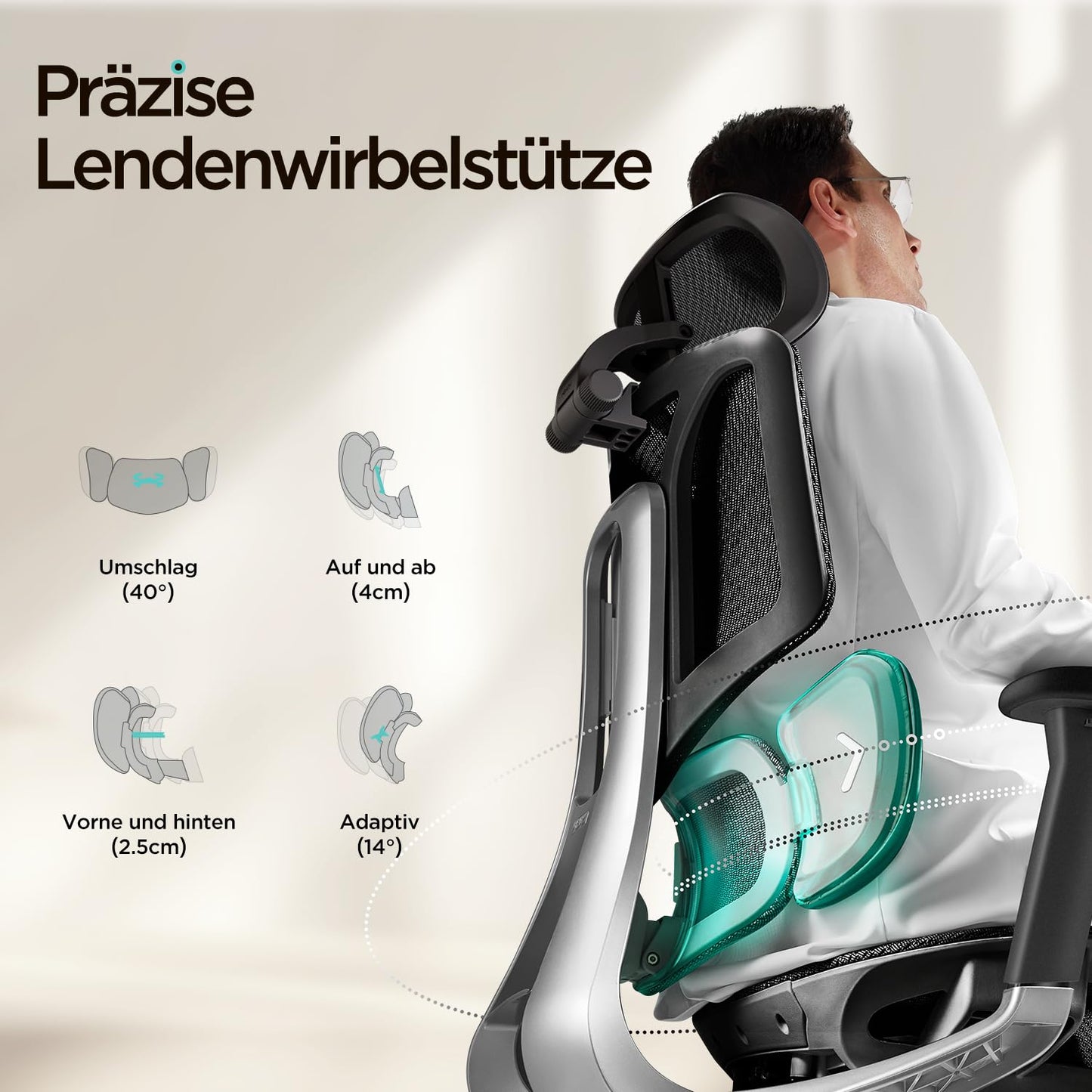 "Innovative ergonomic office chair The ergonomic office chair Hbada E3 combines the latest technologies to help you maintain a comfortable posture and lead a healthy lifestyle. This office chair features an elastic lumbar support, 3D adjustable headrest and armrests, durable and breathable mesh fabric, 140-degree tilt, adjustable seat depth, and gravity-sensitive chassis, providing long-lasting comfort."