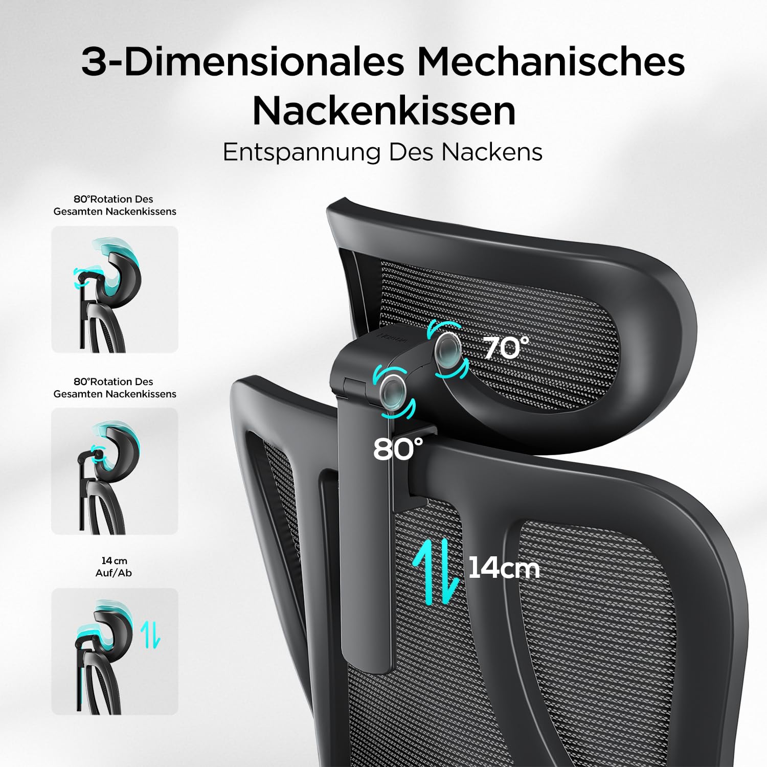 3D adjustable headrest: The headrest can be adjusted 14cm in height, rotated 80°, and tilted 70° to fit perfectly on the head and neck.