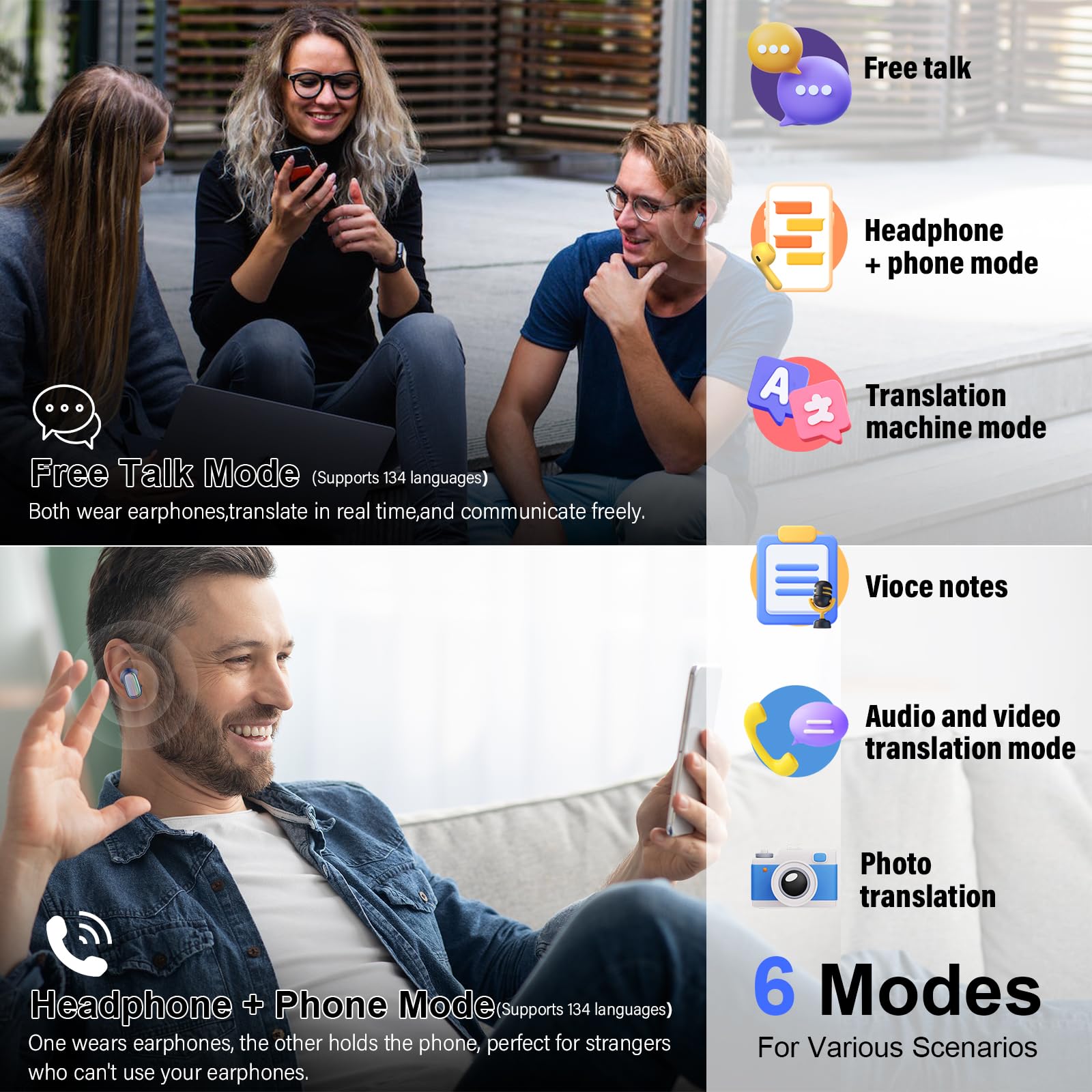 "164 languages and 6 translation modes: H63 language translator headphones are equipped with an intelligent AI translation engine with 6 translation modes and support instant translation between more than 164 languages. Headphone and mobile phone mode; Simultaneous interpreting mode; Text mode with camera recognition; Dual headphone mode; Audio and video call mode; Recording mode. Whether it's a business meeting or cross-border friendship - barrier-free communication is possible."