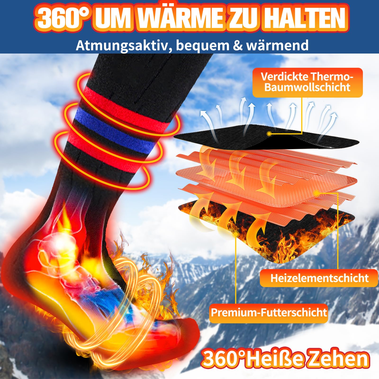 ["🔥【3 Layer Material Design】Outermost thickened thermal cotton layer can effectively trap body heat and block the convection of hot & cold air; Middle layer is the heating element layer, which heats up quickly; innermost premium lining layer conforms to human skin to provide a comfortable experience. Heated socks can keep your feet warm, ideal for people with arthritis, poor circulation & stiff joints.","🧦【One Size Fits Most】Universal size heated socks for men and women (fits US 6-12), super elastic, stretchable, not picky about foot shape, Warm socks are marked with L/R to make wearing easier. Heated socks have a battery pocket with a button to prevent the battery from falling out while walking or running. The black socks are versatile and can be paired with your sneakers, leather shoes, boots, and rain boots.","🔋【5000mAH Battery & 3 Heating Levels】BIBURY heated socks are powered by a rechargeable battery with 3.7V/5000mAh*2, which lasts 6-7 hours on the highest heating level, and 10-11 hours on the lowest heating level, meeting the requirements for long-term outdoor activities. The 3 heating levels correspond to 40-45℃/50-55℃/60-65℃, and the constant temperature control ensures that your feet feel comfortable at all times and promotes circulation.","🌡️【360°Heating & Fast Heating】Heated socks integrate heating wire and power cable fully into the sock body through a new knitting process, and heating elements cover the entire sole and instep of the feet, 360° heating, appearance & durability significantly improved. With built-in, high-quality heating wire and 3.7V USB cable, you will feel warm within 30s after putting them on, Beheizte fusswärmer are comfortable to wear, warming the entire foot.","🎁【Winter Warmth Essentials】Electric heated socks are essential for life in winter at home and perfect for winter outdoor sports enthusiasts, allowing you to enjoy fishing, skiing, camping, hunting, climbing, hiking, or working outdoors, bid farewell to the cold with your feet! Battery heated socks are the perfect Christmas gift for your family, lovers, and friends, allowing your loved ones to have a warm winter."]
