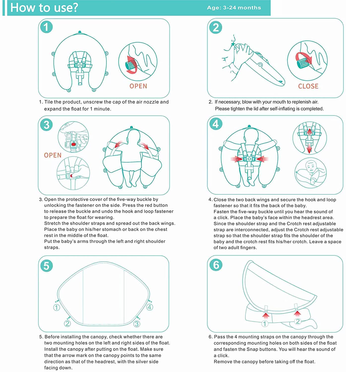 The improved safety buckle provides 5 support points and a perfect 40° angle to maintain balance and prevent the baby from tipping over and falling off. Suitable for babies from 3 months in two swimming styles: backstroke (3-12 months) and breaststroke (3-24 months).