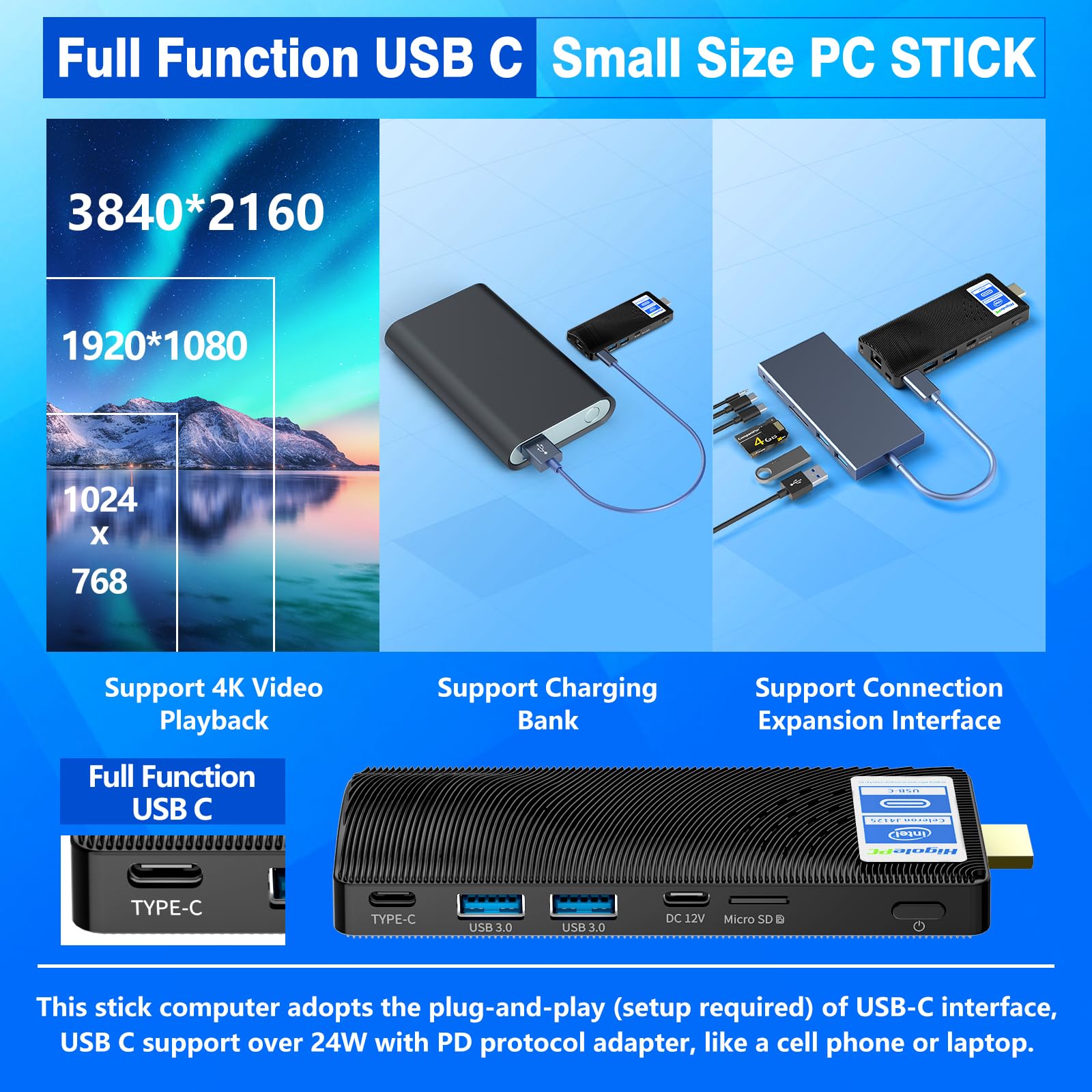 ["【Supports USB PD 3.0 Charging】The PC Stick is a fully functional USB C interface that supports USB PD 3.0 charging. It can be powered by PD-compatible chargers (>24W) and power sources such as portable batteries or stations with voltage and power over 12V. It also allows for data transfer. With its slim and portable design, this mini computer enables streaming, browsing, and multitasking anytime, anywhere.",