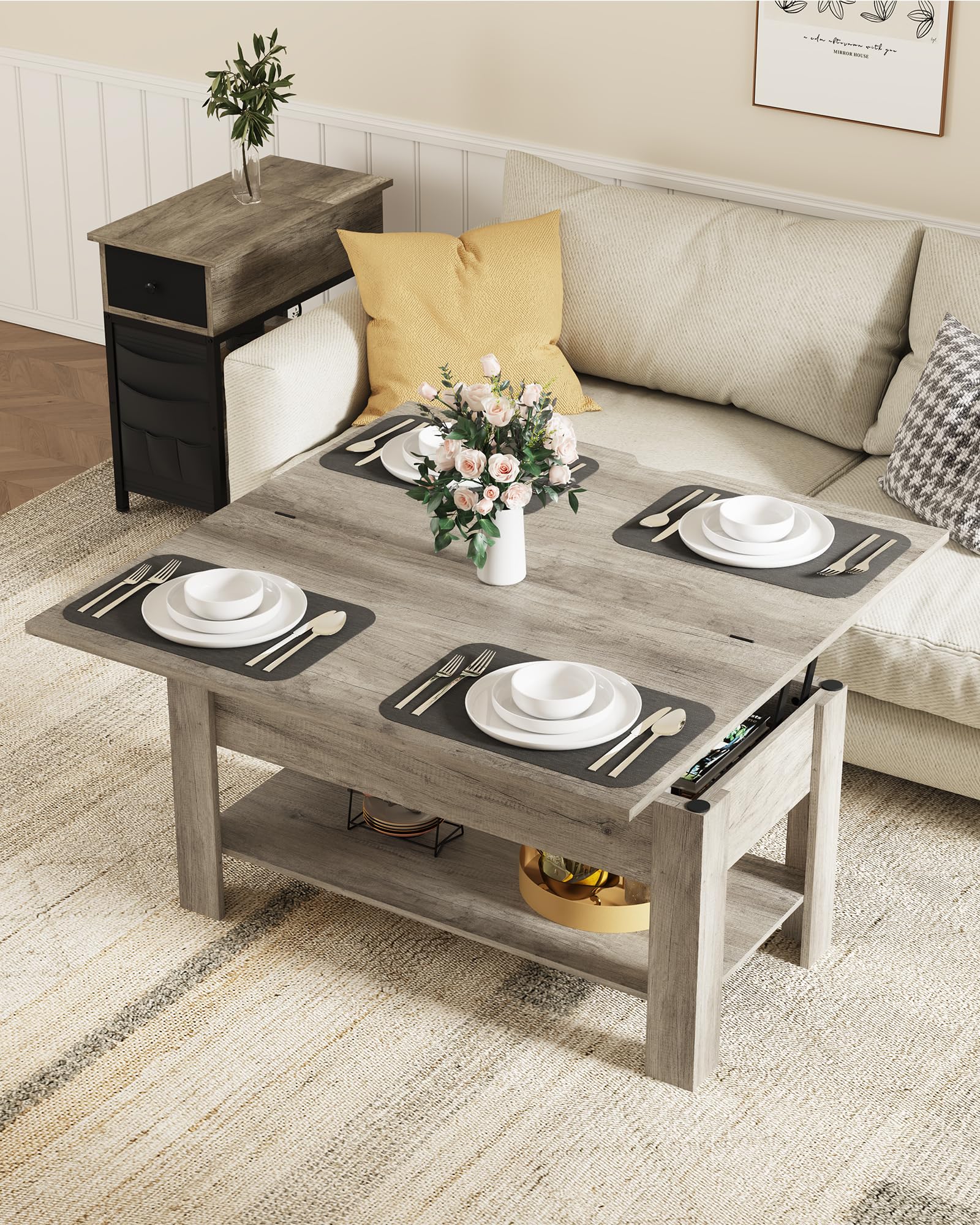 ["For small spaces: The coffee table with a lifting surface can be effortlessly unfolded. Normally, the table is 19.7"T x 39.4"W x 18.3"H, ideal for small spaces. In the unfolded state, the table becomes 39.4"T x 39.4"W x 24.4"H. This multifunctional 3-in-1 living room table can perfectly meet your various daily needs. 3 colors (white, gray, and brown) to choose from, suitable for multiple home styles. The coffee table can definitely be integrated into the existing decor.","Versatile: When the 2 tabletops are lifted simultaneously, the elegant coffee table transforms into two independent workspaces where two people can work simultaneously without disturbing each other. And you can also fold out the larger tabletop by 180°, then it becomes a dining table for 6-8 people. Note: Lift the smaller top before unfolding the larger top to avoid damage.","Sufficient storage space: This coffee table offers plenty of storage space. There is hidden storage space under the tabletop. Below it, there is an open shelf where you can place storage boxes, decorations, or books.","Solid and durable: The coffee table is made of high-quality MDF board and a sturdy metal lifting mechanism, ensuring smoother height adjustment and high load capacity. In addition, there is a cut-out handle on the side of the waterproof and durable tabletop, making it easier to open the height-adjustable coffee table and preventing finger injuries. The L-shaped wooden legs increase stability and reduce floor wear.","Quick assembly: With the labeled parts and detailed instructions provided, assembly is easy. If you receive a defective coffee table or if any accessories are missing, please do not hesitate to contact us, we are always available to assist you!"]