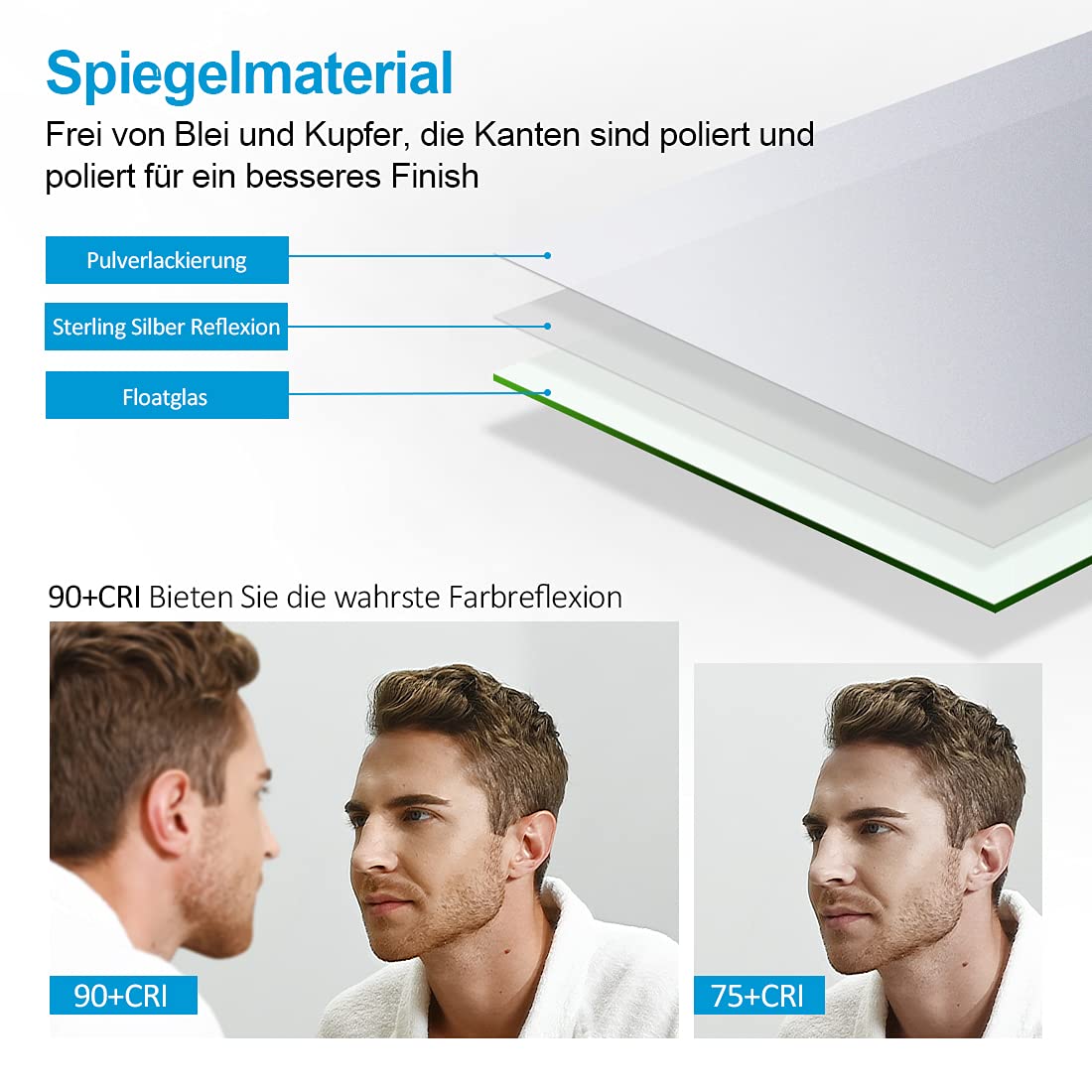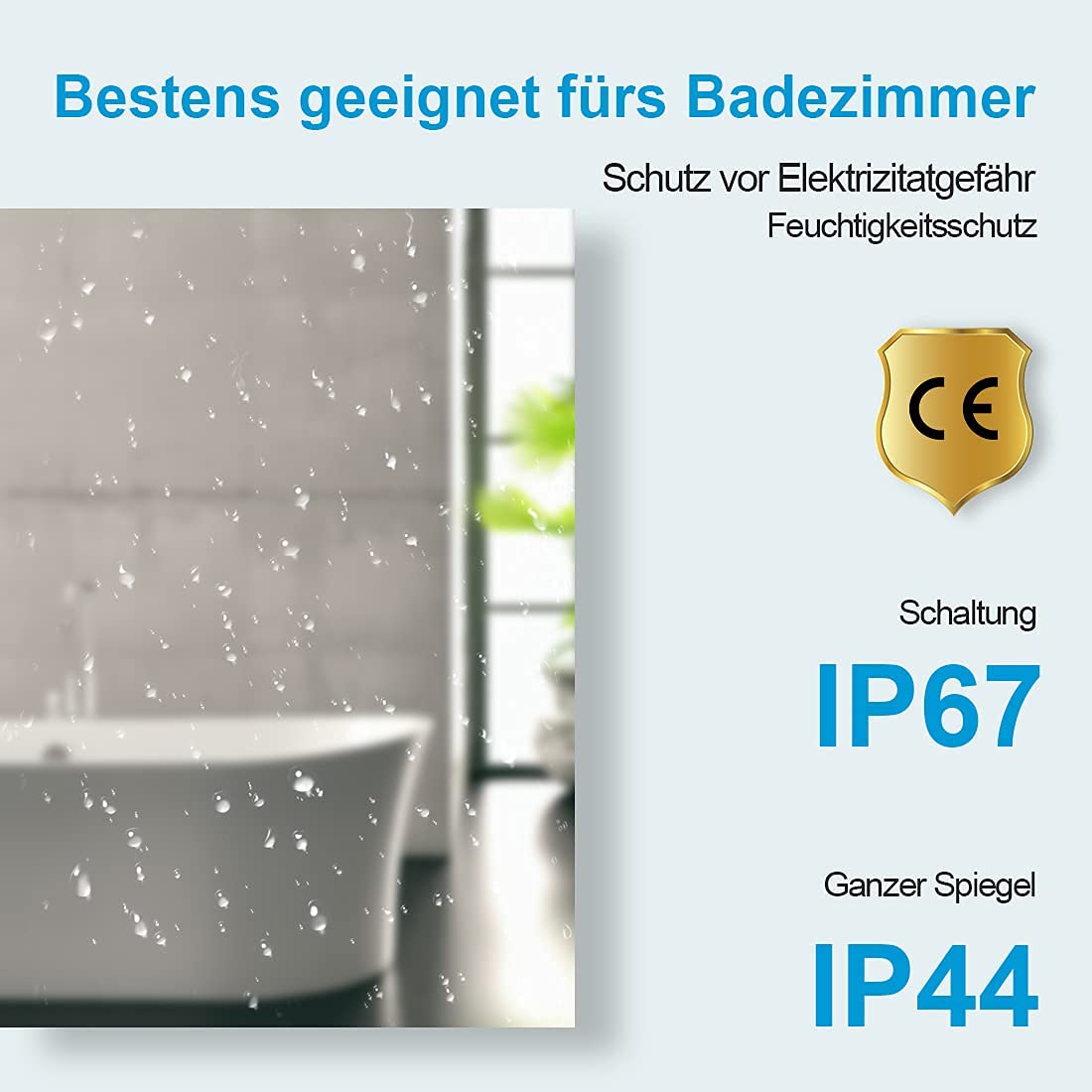 ["Modern luxury】Our bathroom mirrors with lighting provide the perfect combination of functionality and style to make every moment in the bathroom a luxurious experience.","【Atmospheric light】The warm white light with a color temperature of 3000K surrounds the bathroom mirror and creates a cozy and comfortable atmosphere, perfect for relaxing moments during your daily grooming routine.","【21W energy saving】Bathroom mirrors with lighting provide bright and uniform illumination with minimal energy consumption. Integrated LED strips have a lifespan of about 50,000 hours, which is nearly equivalent to 10 years of operation.","【Easy to use】Bathroom mirrors with lights are activated by a wall switch (not included). This classic design ensures easy and safe operation. And with horizontal and vertical mounting options, it offers greater flexibility during installation.","【Good quality】Bathroom mirrors with lighting feature an aluminum frame, a PVC back panel, and an IP44 protection rating, protecting it from moisture and dust. This makes bathroom mirrors with lighting the perfect choice for bathrooms and other damp environments."]