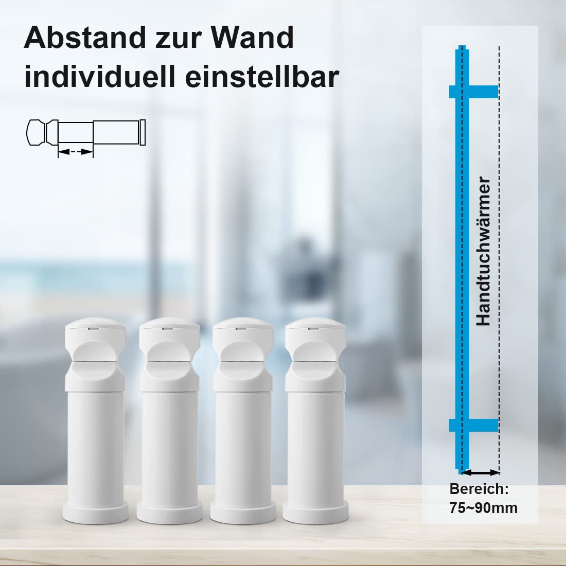 ["WALL BRACKET FOR RADIATOR"] Holder for towel radiator suitable for radiators with straight. ["APPLICATION"] Our radiator bracket attachment is suitable for radiators with a pipe diameter ∅22*40 and ∅22*37mm. ["ADJUSTABLE"] Mounting material adjustable size 15 mm (the distance from the center of the bracket to the wall after installation is 75 ~ 90 mm). ["PORTABLE INSTALLATION"] This mounting kit is not only easy to install but also stable, and the stand is adjustable in height. ["INCLUDED IN DELIVERY"] In addition to the four wall brackets, you will also receive an air vent and a universal blind plug as towel radiator accessories."]