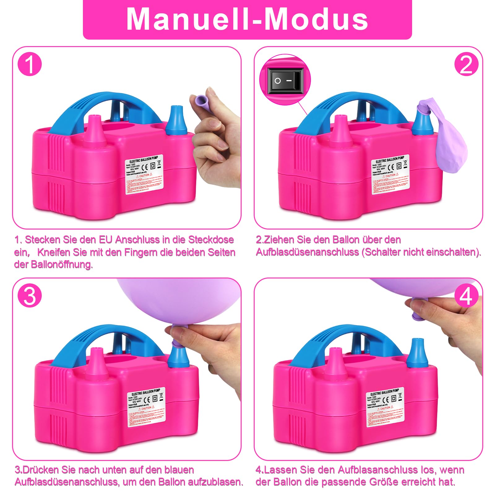 ["【Electric Balloon Pump】We provide 3 extra accessories. The labor-saving tying tool together with the electric balloon pump can help you decorate your party better and create a romantic and warm atmosphere.", "【2 Inflation Modes】HELESIN Balloon Pump with 2 inflation modes. \"O\": manual mode, gently press the blue inflation nozzle to inflate the balloon, release it to stop inflation; \"—\": automatic mode, inflate faster. During the operation of the balloon pump, noises can be heard, which is normal.", "【Efficient and Safe】The motor power of the electric balloon pump is 600 W, making inflation more efficient. Hide the wires in the wire box after use, which is safe, neat, and beautiful. WARM TIP: To extend the life of the balloon inflator, let it work for 15 minutes and then take a break!", "【Suitable for Many Types of Balloons】HELESIN balloon inflator has two elongated nozzles, if you want to inflate small balloons, the small nozzle can meet your needs. (Not suitable for long balloons and swim rings)", "【Wide Application】HELESIN Electric Balloon Pump can help you not only decorate your birthday party. Electric Air Pump for Balloons are very good assistants in wedding decoration, graduation ceremony, and festival decoration."]