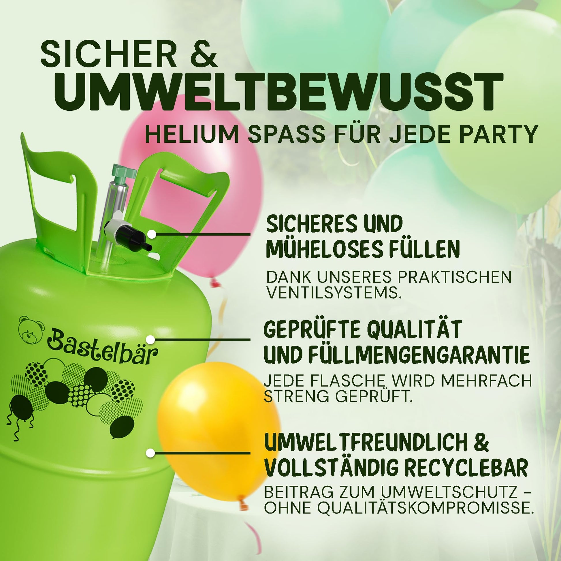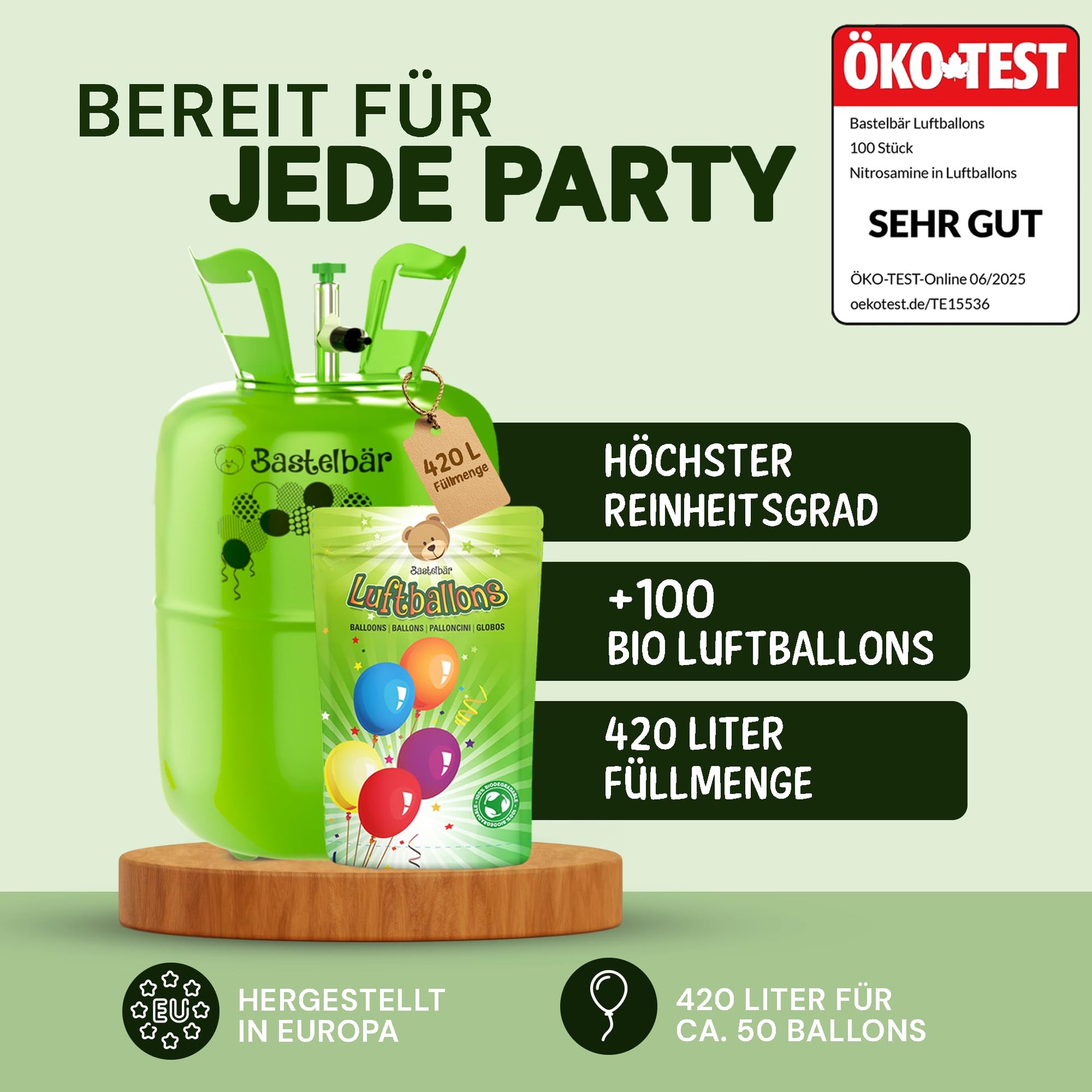π BALLOON GAS COMPLETE SET INCLUDING 100 US LATEX BALLOONS ECO-TEST \"VERY GOOD\": Our gas cylinder comes with 100 high-quality and sustainably produced balloons from European manufacture. The balloons were tested in the June issue of ΓKO-TEST Online for their pollutant content (nitrosamines) and received the highest rating \"VERY GOOD.\"