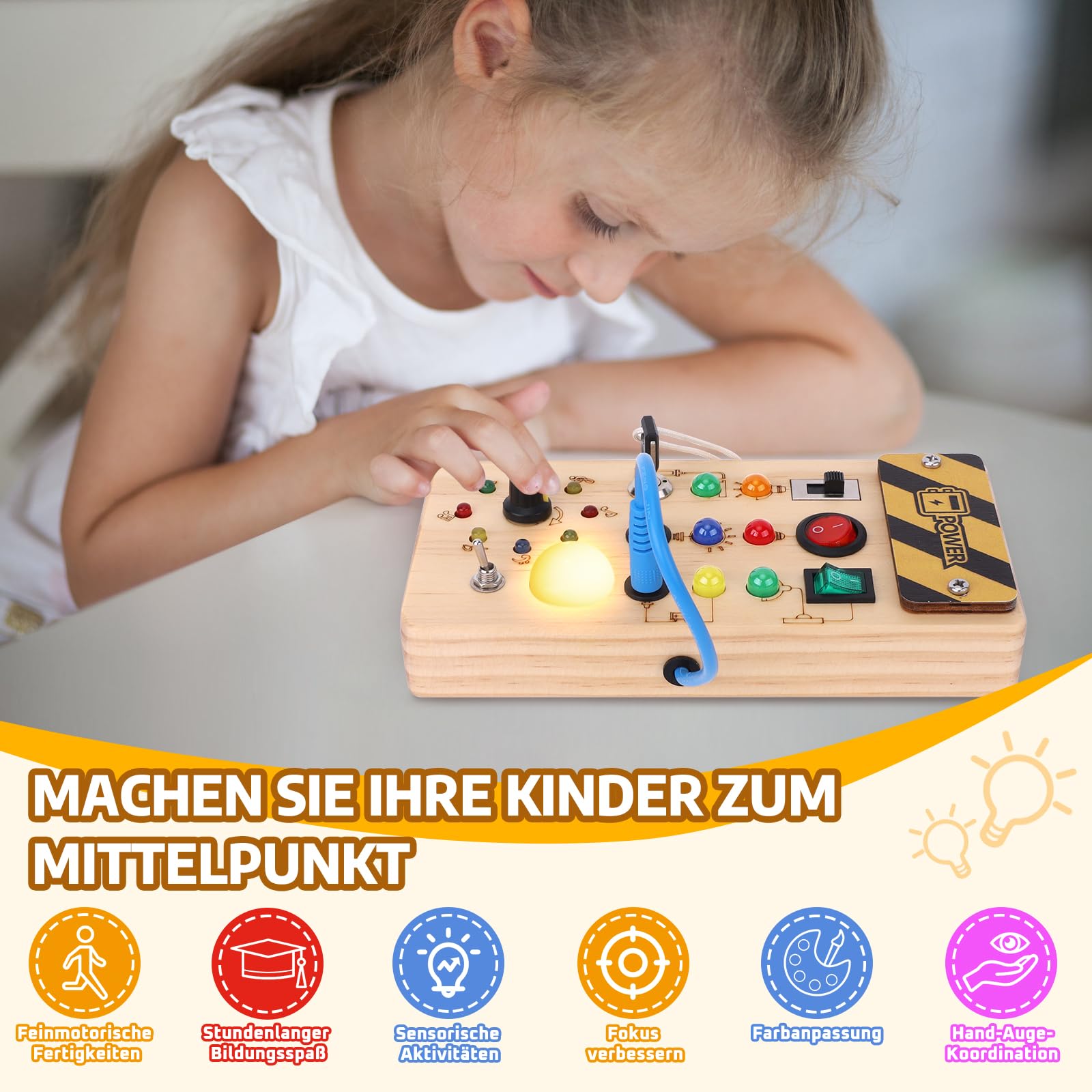 ["【Montessori Learning Toy】When toddlers press different switches, the corresponding LED lights up, which is a great way to stimulate the baby's curiosity. This sensory wooden toy can train your baby's thinking and practical ability to recognize different colors and develop their potential, creativity, and imagination.","【Special Design】The Montessori board is specially designed for young children who like switches and LED lights. This busy board is equipped with 8 different switches, each corresponding to a different color or type of LED light. The brightness of each LED light is set to protect the baby's eyes. The buttons and switches are large enough to fit toddler fingers and easy to press.","【Natural Wooden Toy】The Activity Board Baby is made from natural wood logs, cut in whole pieces and not glued together as a board. All parts are finely sanded to ensure the safety of your baby. Before use, the cover marked \"POWER\" must be unscrewed and 2 AAA batteries prepared (not included).","【Small and Portable Travel Toy】This electronic Busy Board Toddler Toy measures 9*1.5*2 inches without small parts that can easily come off, perfect as a travel toy, especially in the car or on the go, to keep your baby busy for hours and make them happy to reach their destination.","【Best Gifts for Toddlers】LED Busy Board is perfect as early learning toy for toddlers from 1 year old, it can be used as a birthday gift for children, family celebration gift, Children's Day gift, Christmas gift, and so on. If you find quality problems after receiving the goods, feel free to contact us. We will repair it for you within 24 hours. This wooden toddler activity board comes with a one-year warranty."]