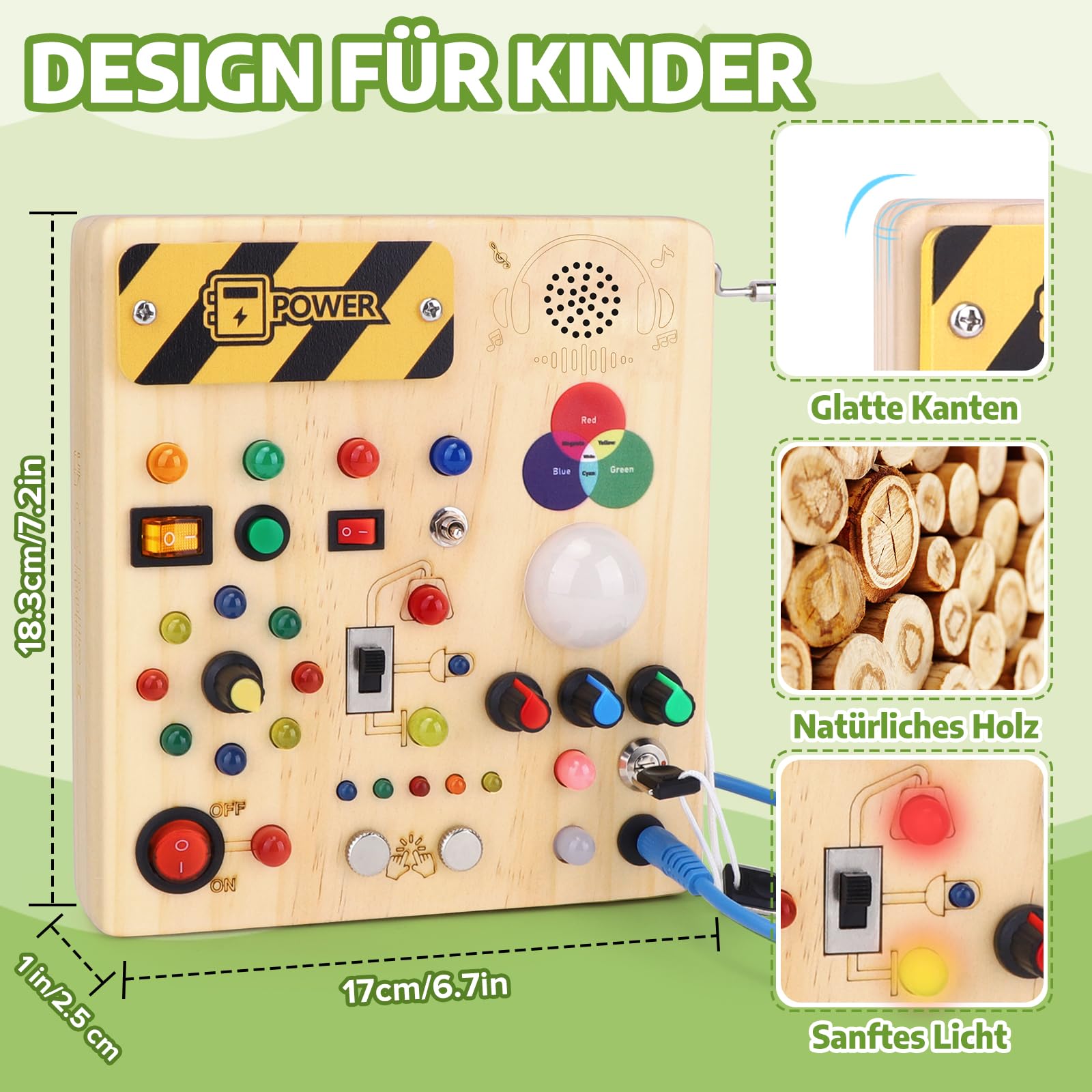 ["Upgraded Montessori educational toy This busy board is not only equipped with an on/off switch and LED lights, but also with a rotating music box, color recognition function. Different operations on the busy board like turning, pressing, etc. can train babies' fine hand movements and coordination.","Multiple skills for development Understanding the principle of human conductivity and luminosity through practical operation can stimulate the baby's curiosity and cultivate the spirit of scientific exploration. Rotating music box can play music to stimulate the baby's auditory development, at the same time, the baby can practice hand-eye coordination through operating the music box rotation and other actions.","Promotes visual development of babies The Montessori board is specifically designed for young children who like switches and LED lights. This busy motherboard is equipped with 13 different switches, each corresponding to a different color or type of LED light. The color mixing recognition function of the three primary colors red, green, and blue can help babies learn the basic knowledge of colors.","Natural wooden travel toy The activity board for babies is made of natural logs and all parts are finely polished. This electronic toy for toddlers measures 18.4 x 17 x 2.8 cm, making it ideal as a travel toy. Before use, you need to unscrew the "POWER" cover and prepare 2 AA batteries (not included).","Best gifts for toddlers LED Busy Board is perfect for early learning toys for toddlers from 1 year old, it can be used as a birthday gift for children, family celebration gift, Children's Day gift, Christmas gift, and so on. If you find quality problems after receiving the goods, feel free to contact us. We will solve it for you within 24 hours. This wooden busy board for toddlers comes with a one-year warranty."]
