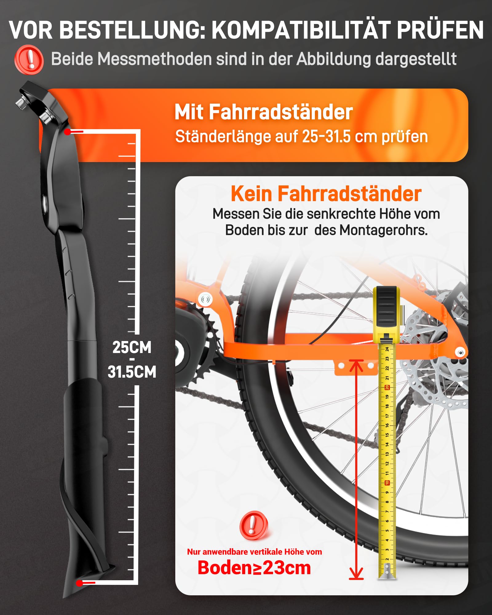 Note: ① Please check the dimensions before purchasing. ② Measure the vertical height from the mounting point to the ground to ensure that the stand is suitable for your bike. ③ Note that the upper part of the stand is equipped with an M6 screw and the extendable part with an M5 screw. ④ This bike stand is not suitable for the following bikes: WOOM."