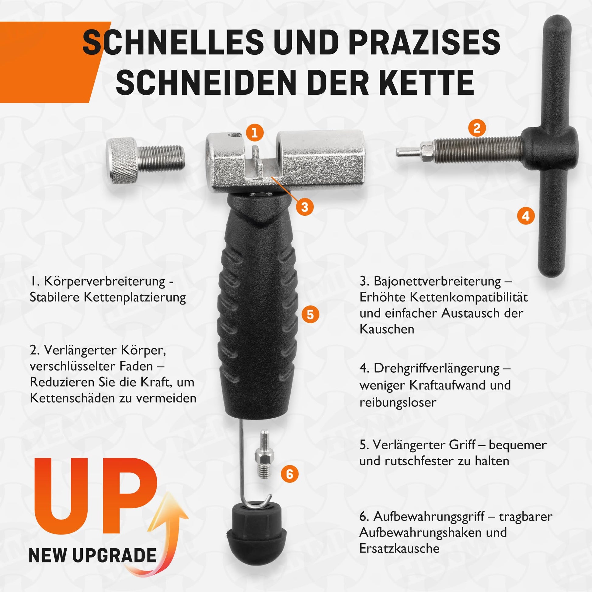 ["Bike Chain Cutter Set Pro: The bike chain cutter set contains everything you need for a seamless bike chain repair, Ideal for bike repairs. Includes chain lock pliers, bike chain cutter, chain measuring tool, 4 pairs of bike chain rivets for 6-7-8, 9, 10, 11 speed chain, storage box, and instructions.","Upgrade Bike Chain Cutter: The bike chain handle features a storage design, this innovative storage handle design for chain cutters makes carrying and using chain hooks and shackles easier, so you always have everything at hand! Please note that replacement cotter pins and a chain hook were equipped in the handle of the \"storage handle\".","Efficient and Smooth Chain Cutting: Main body of the chain cutter is widened to place the chain more stable and make cutting easier. Extended main body, encrypted thread, reduces jamming during the screwing process, makes the process smoother and more labor-saving, and prevents damage to the chain. Improvements in detail make your repair more efficient and comfortable.","High-Precision Bike Chain Measuring Tool: Quick and easy measurement of wear. Made of hardened steel, two precision indicators of 0.75 and 1.0. So 0.75 is the official wear limit for chain use, 1.0 for use on steel sprockets.","2-in-1 Chain Pliers: The 2-in-1 chain pliers act as both a chain link remover and connector. The ergonomic handle provides maximum comfort and user-friendly handling. Compatible with 7, 8, 9, 10, 11, 12 speed bikes. And chain lock pliers of the plier handle with a latch, close the latch for small size for storage.","Easy to Carry: It is small and sturdy, easy to carry, can be used as a travel tool kit to fix most bike problems. Bike chain tool Suitable for trekking bikes, city bikes, mountain bikes, and racing bikes, etc.","Note: There is grease on the bike chain tool. Please make sure it is not contaminated. Lubricating oil allows for smoother use of tools, prevents rust, and extends the life of the tool."]