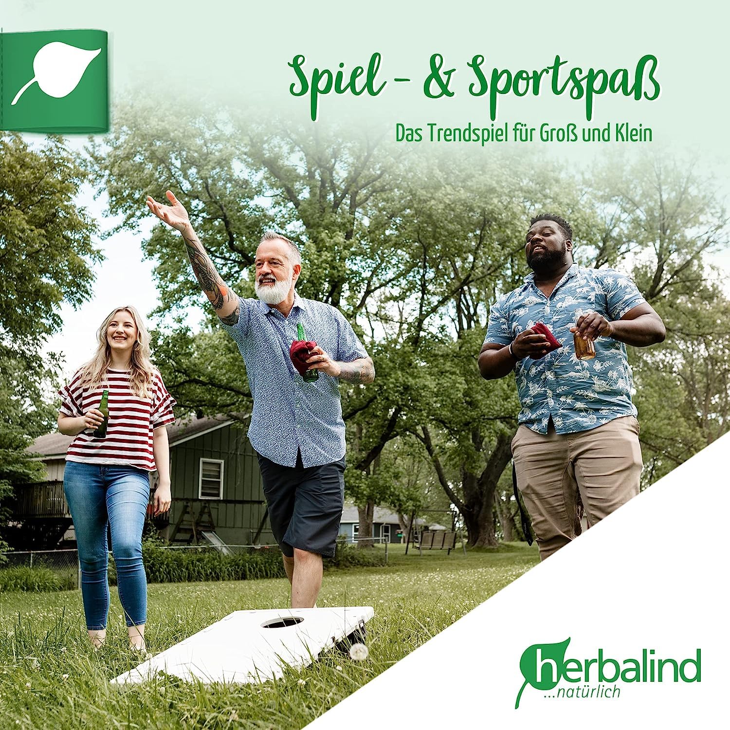 ["π― THE HERBALIND CORNHOLE BAG is a throwing bag used for playing Cornhole. Cornhole bags are square and must be thrown cleanly, directly into the hole in the Cornhole board.","π― OUR HIGH-QUALITY CORNHOLE BAGS are made of sturdy fabric and handcrafted with premium quality and workmanship for great fun.","π― THE HERBALIND CORNHOLE BAGS are very well-made, durable, very robust, and easy to handle. The bags measure 15 x 15 cm and fit perfectly in the hand.","π― ORIGINAL FILLING - the throwing bags are filled with corn, hence the name, as corn is called "corn" in English. The weight of about 400g meets the official requirements.","π― BUY AND DO GOOD - All corn bags are lovingly handcrafted in our integration company! Made in Germany. Premium quality. Non-profit - regional."]