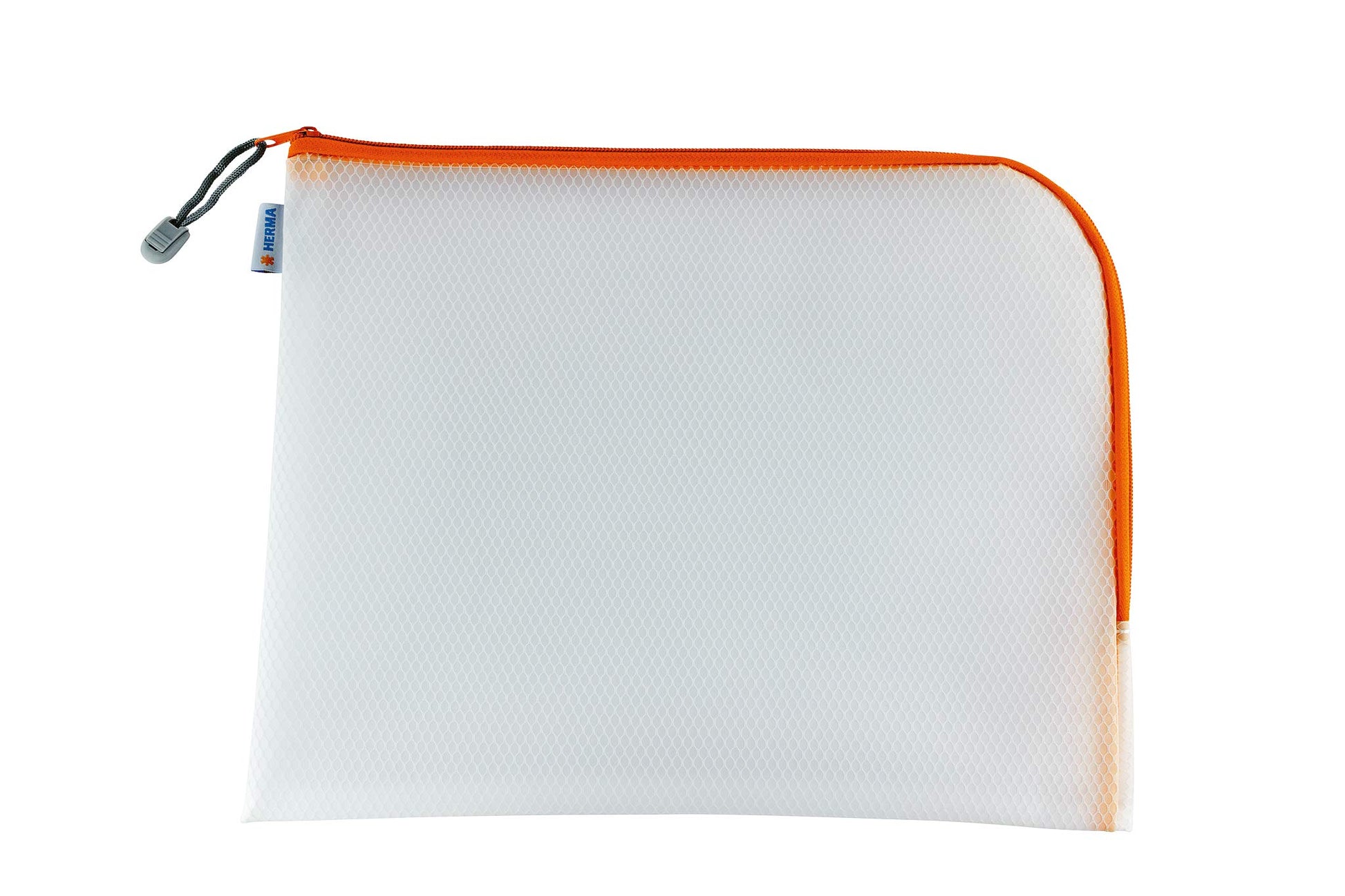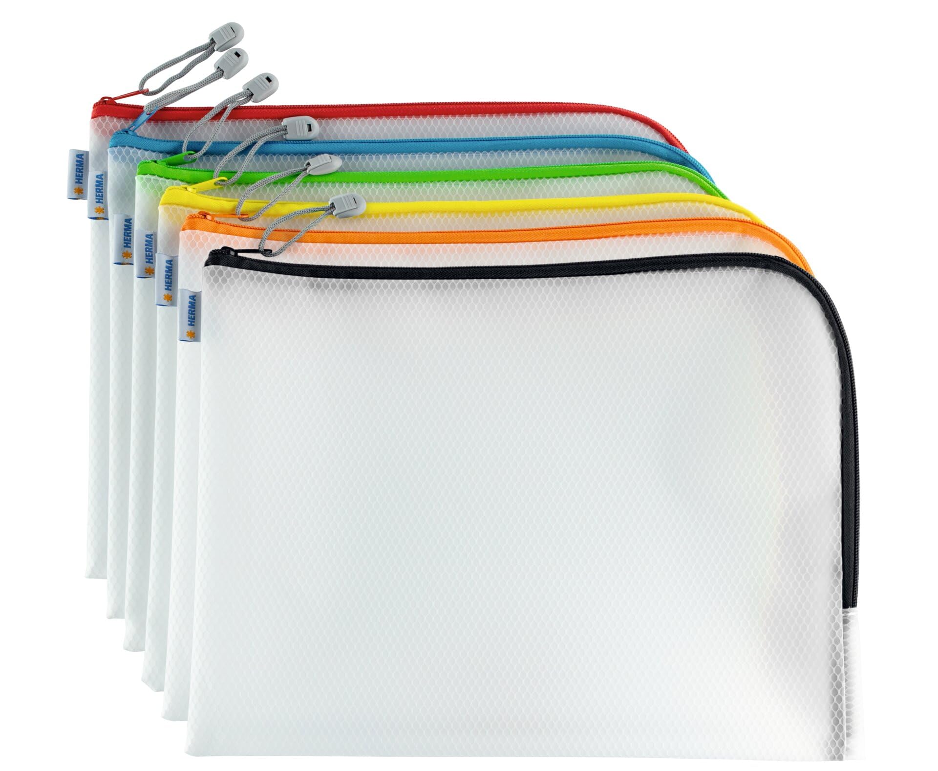 ["High-quality mesh bag with sturdy grid reinforcement and practical corner zipper","Clear EVA material allows for a quick overview of the contents of the zipper bag","Perfect for secure transport and organization of documents, notebooks, or crafting material","Ideal protection against dirt, moisture, and damage for travel, office, school, and home","Package includes: 10 x HERMA 20013 universal bag A4 assortment, dimensions: 36 x 28 cm (length/width) - 2 x red, blue, green, black, 1 x yellow, orange"]