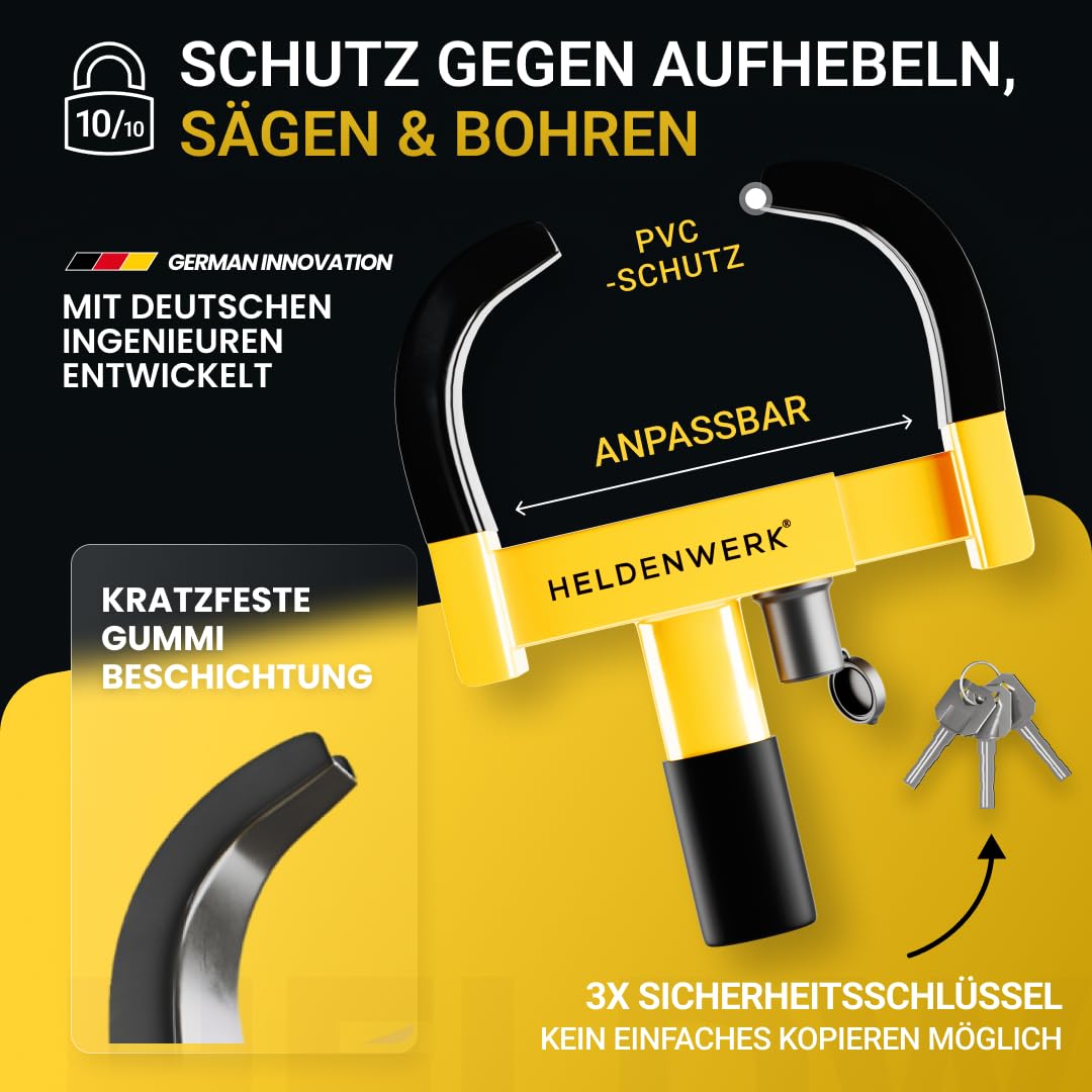 HERO WORK Parking Claw Wheel clamp with high-security lock & 3 keys - for trailers, motorhomes, caravans, cars - car wheel clamp, wheel clamp, wheel claw for 18-30cm tire width (Black/Yellow)