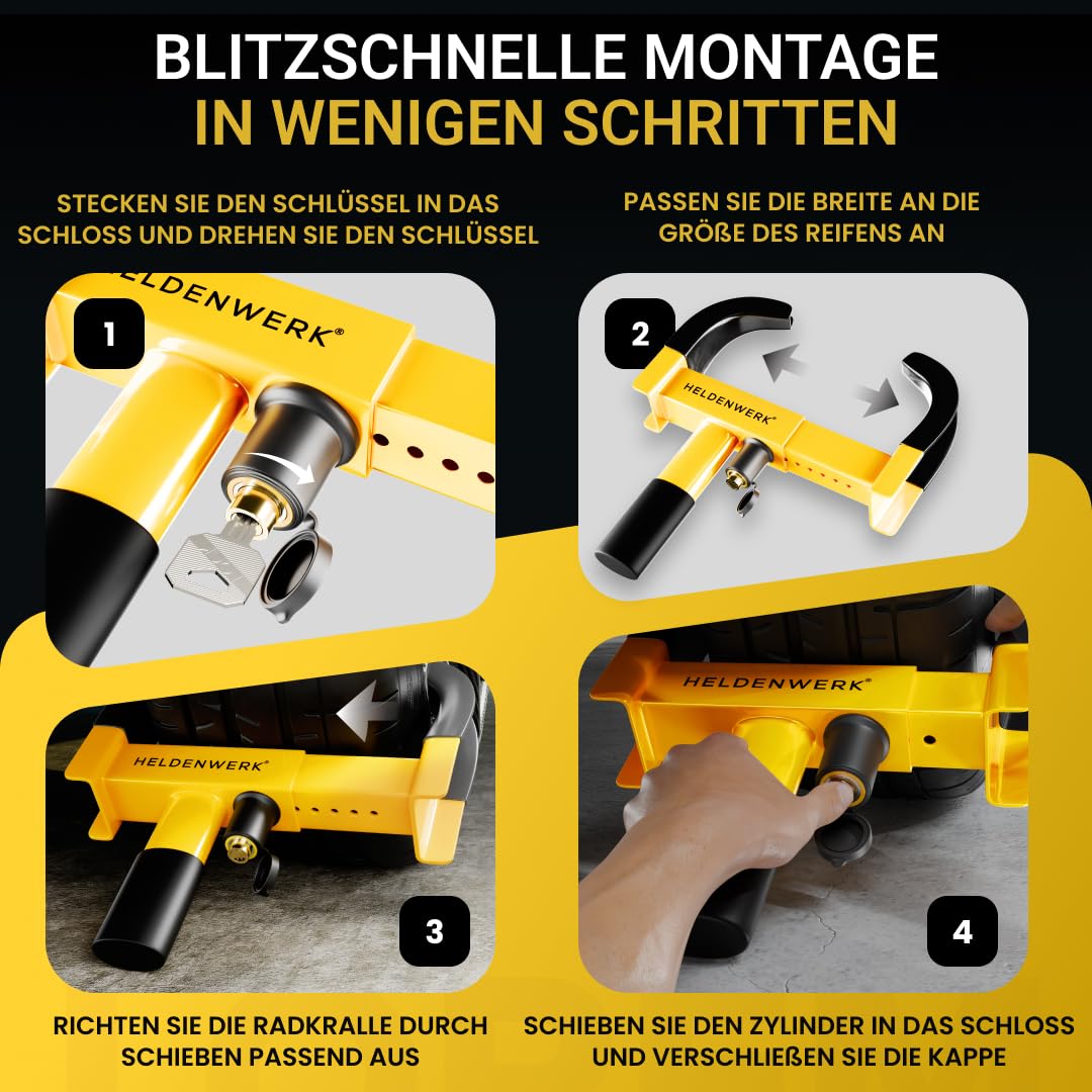 ["MAXIMUM SECURITY - The sturdy car wheel lock with reinforced brass core lock provides optimal protection against theft and vandalism and can be quickly and easily attached.",