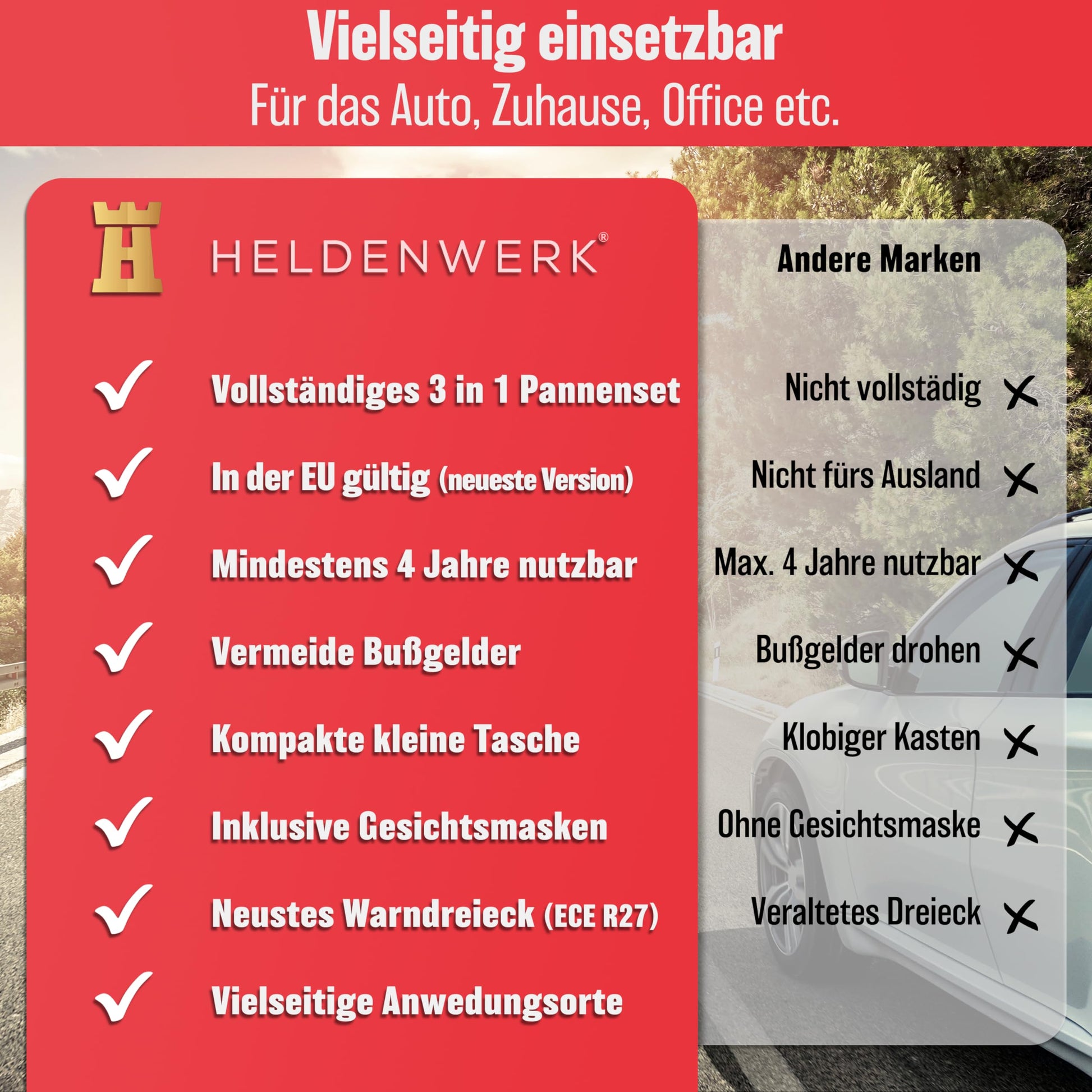 HERO WORK vehicle combination bag (3 in 1) according to current standard 2025 - Including warning triangle, high-visibility vest - First aid kit warning triangle set first aid kit car DIN 13164:2022 (in compliance with road traffic regulations)