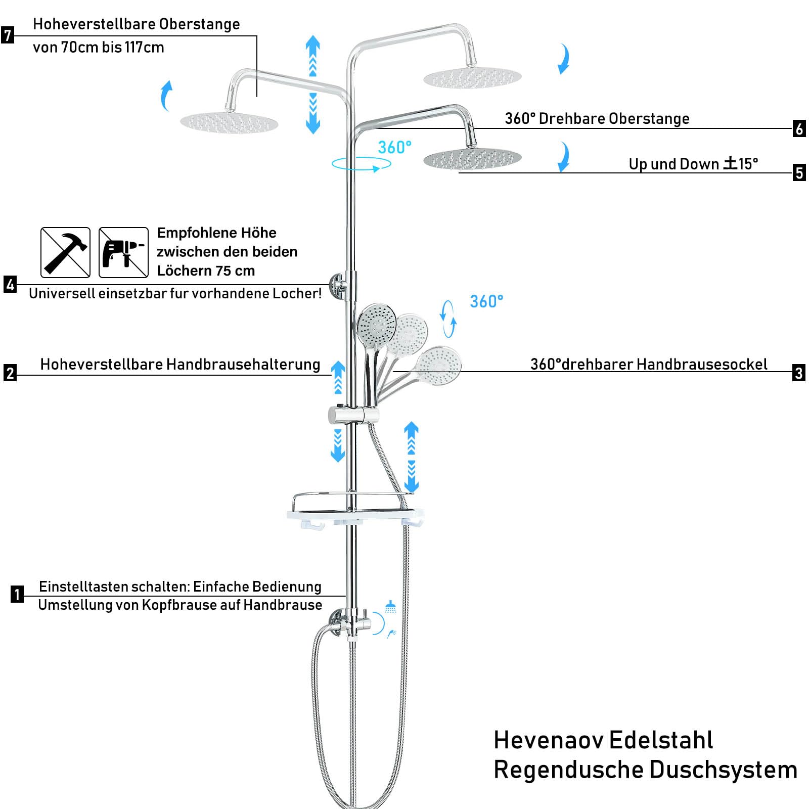 "❤Height adjustable rain shower without mixer: The shower set without mixer has a 47 cm long arch and a 70 cm long straight pipe. The height of the shower head rain shower is adjustable between 70 and 117 cm for people of different heights. The two hole spacings are fixed at about 75 cm. So if you want to adjust the height of the shower mixer, simply loosen the fixed threads and slide or push out the arc and fix it to easily adjust the height of the shower completely.