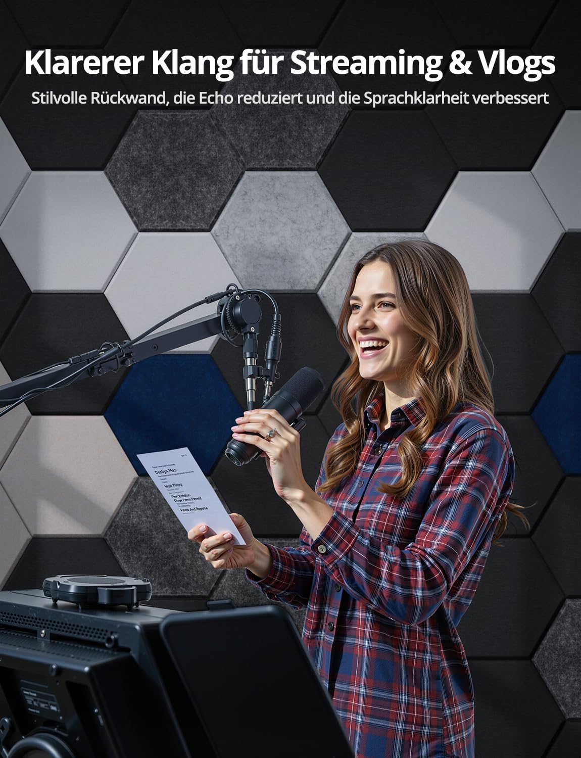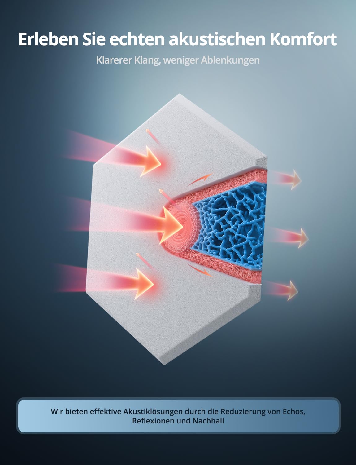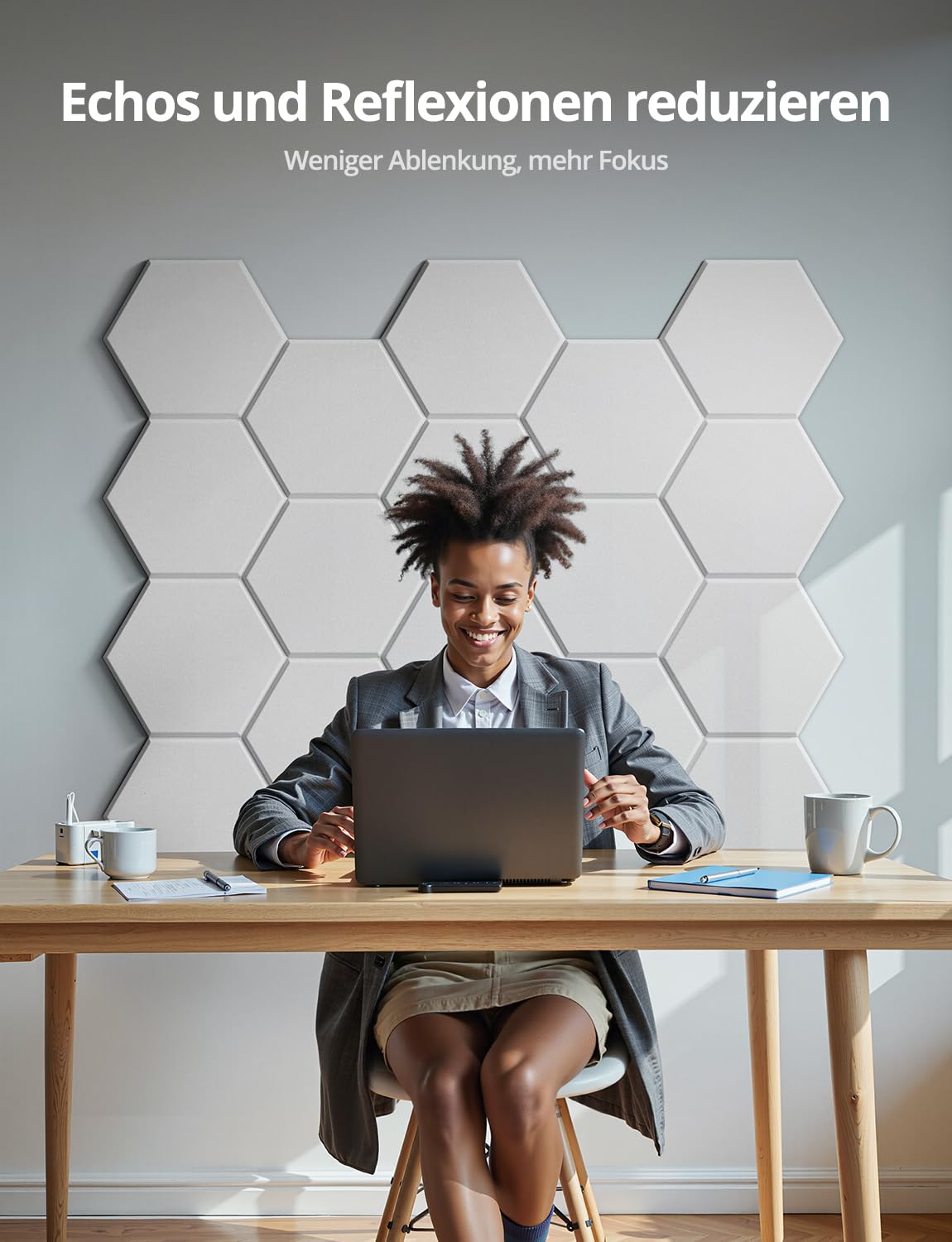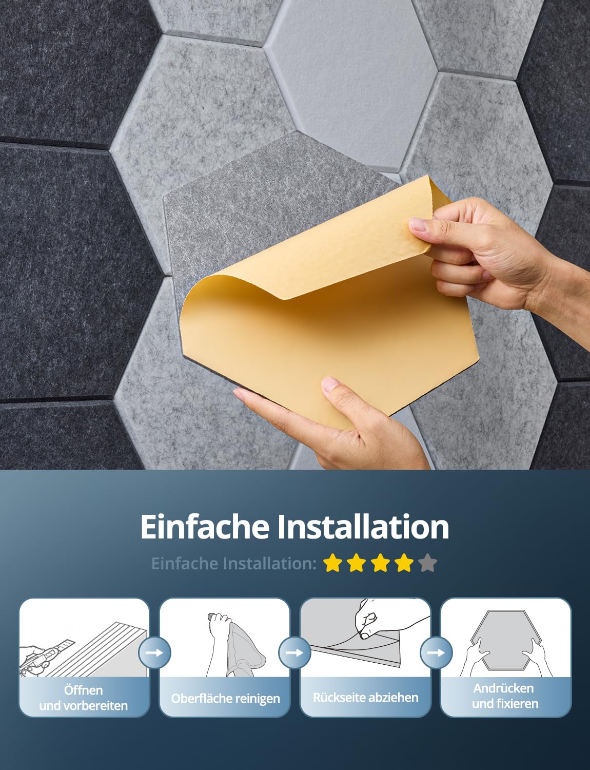 ["Effective acoustic solution: Felt material with high-density, porous structure, primarily designed for treating mid and high frequencies, including absorbing echoes, reducing reverberation, and minimizing reflections.", "Dynamic hexagon design: Adds a special touch to your interior decor. The equilateral design allows the panels to seamlessly connect and create a honeycomb pattern. Customize your space.", "Easy installation: Simply peel off the protective film to install the panels. With a lightweight design and enhanced adhesive strength, they can be easily applied to a variety of surfaces.", "Multifunctional: Kuchoow sound absorbing acoustic panels self-adhesive are laminated and impact-resistant. They can be used as wall protection or background walls for photos or notes.", "Versatile applications: Kuchoow soundproofing panels offer excellent acoustic properties in recording studios, home theaters, conference rooms, offices, music rooms, and other spaces requiring good acoustics."]