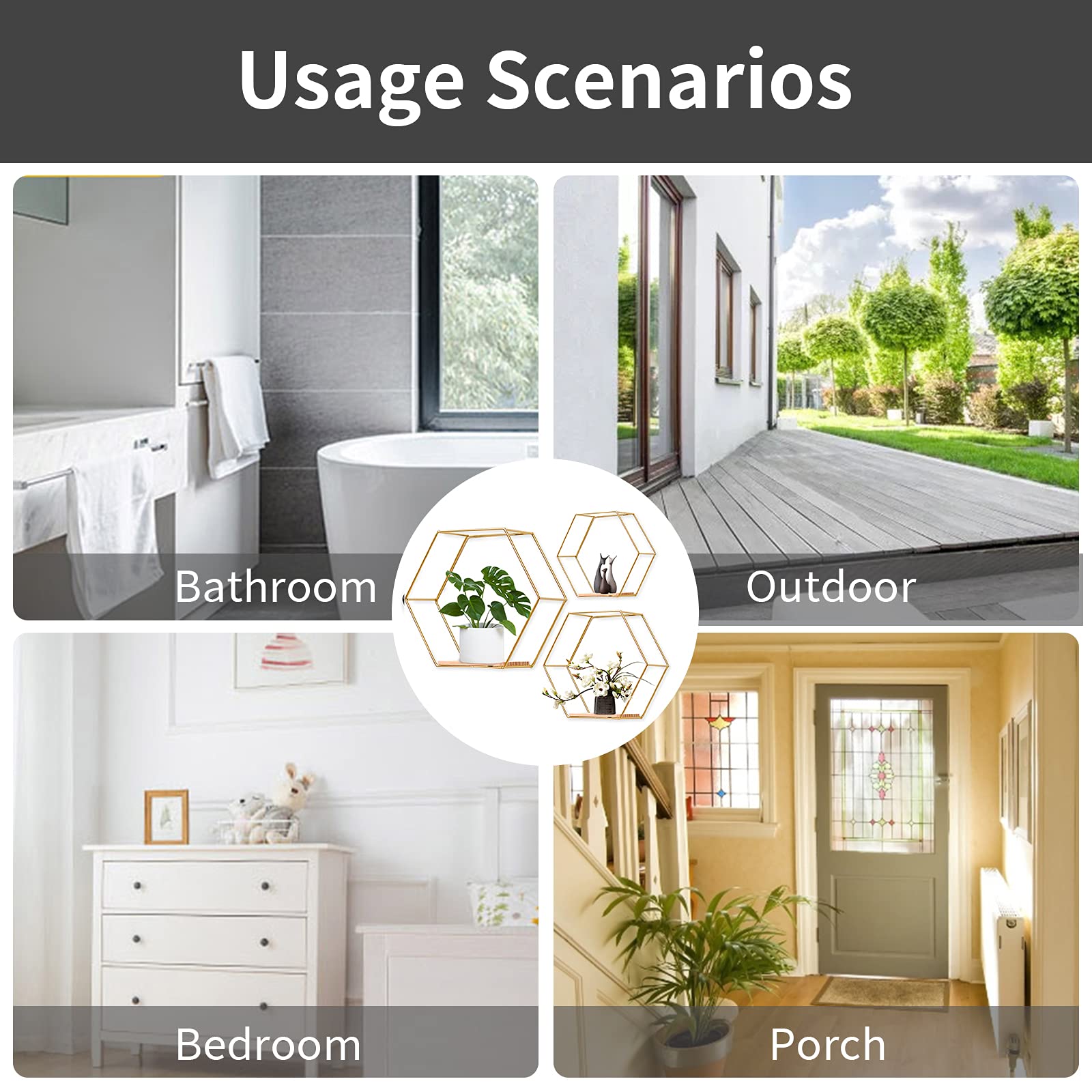 "Versatile Wall Shelves - The package includes 3 differently sized Hexagon Metal Floating Shelves with the following dimensions: 11x10x4 inches, 9.4x8x3.7 inches, 6.7x5.7x3.7 inches. These can be freely placed for decoration. This not only beautifies the wall in the living room, kitchen, hallway, etc., but also provides extra storage space with the shelves (11x4, 9.4x3.7, 6.7x3.7 inches).