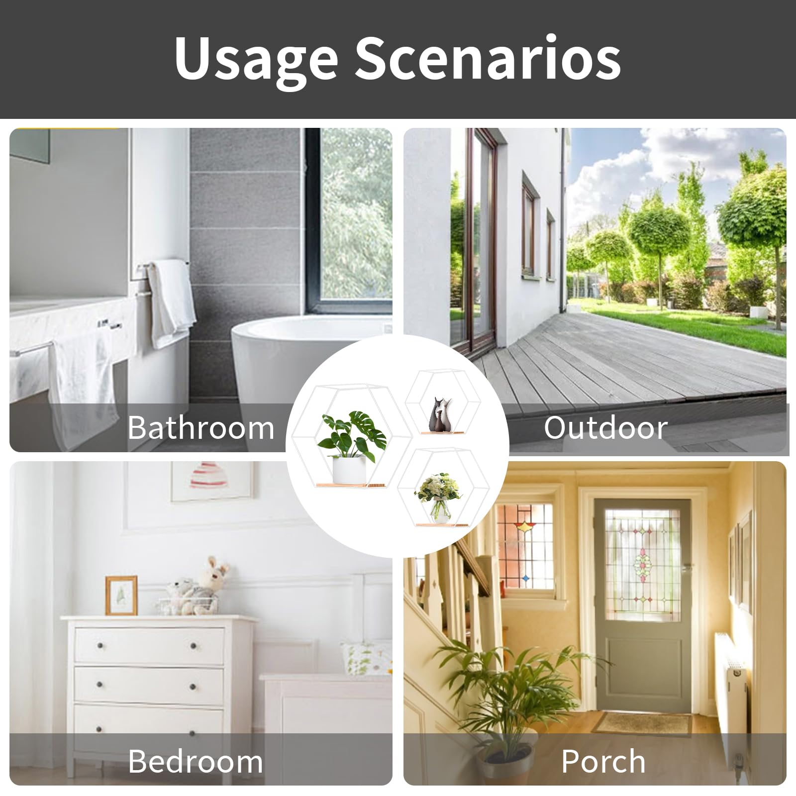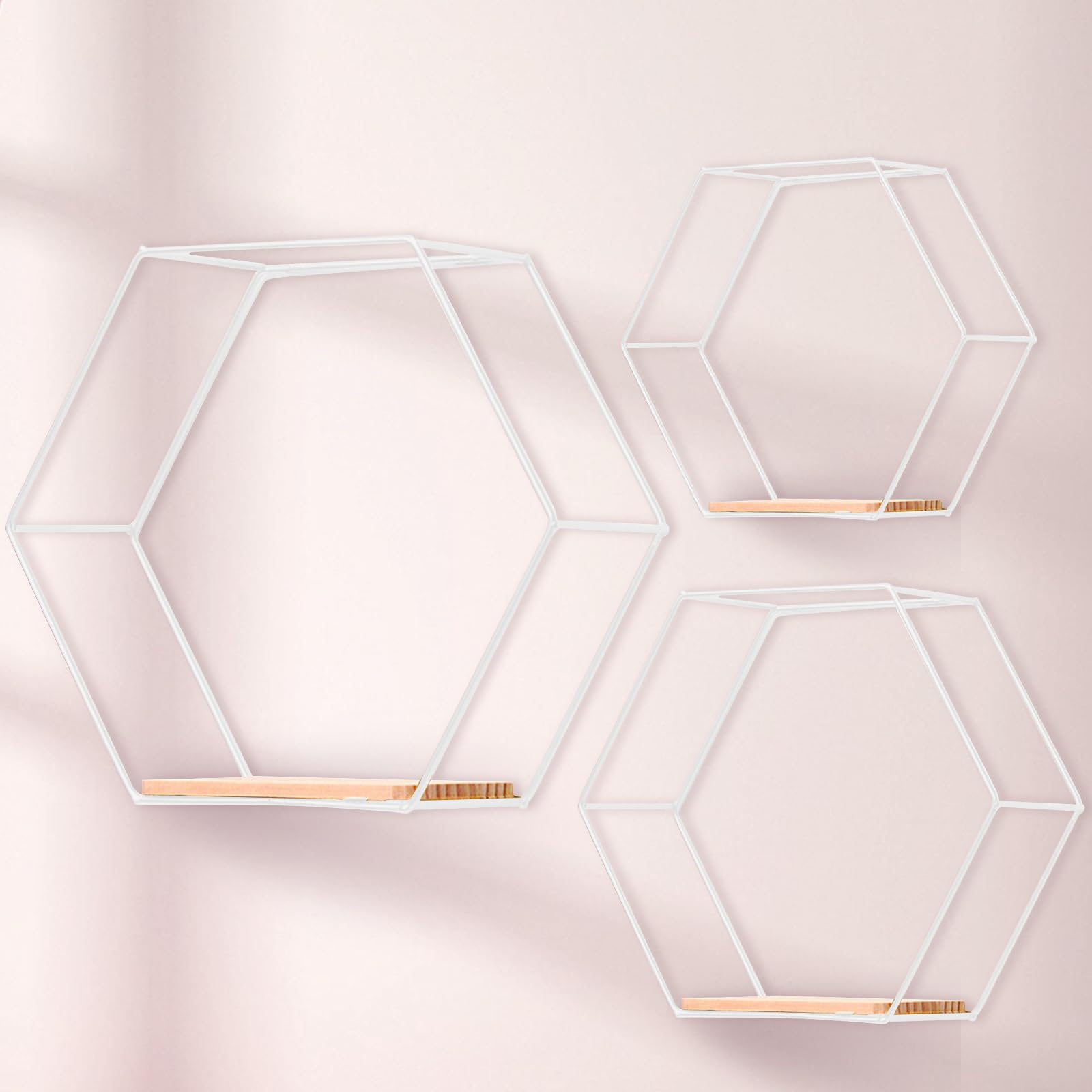 "Versatile Wall Shelves - The package includes 3 different sized Hexagon Metal Floating Shelves in White with the following dimensions: 11x10x4 inches, 9x8x4 inches, 7x6x4 inches. These can be freely placed for decorating. This not only beautifies the wall in the living room, kitchen, hallway, etc., but also provides extra storage space with the shelves (11x4, 9x4, 7x4 inches).