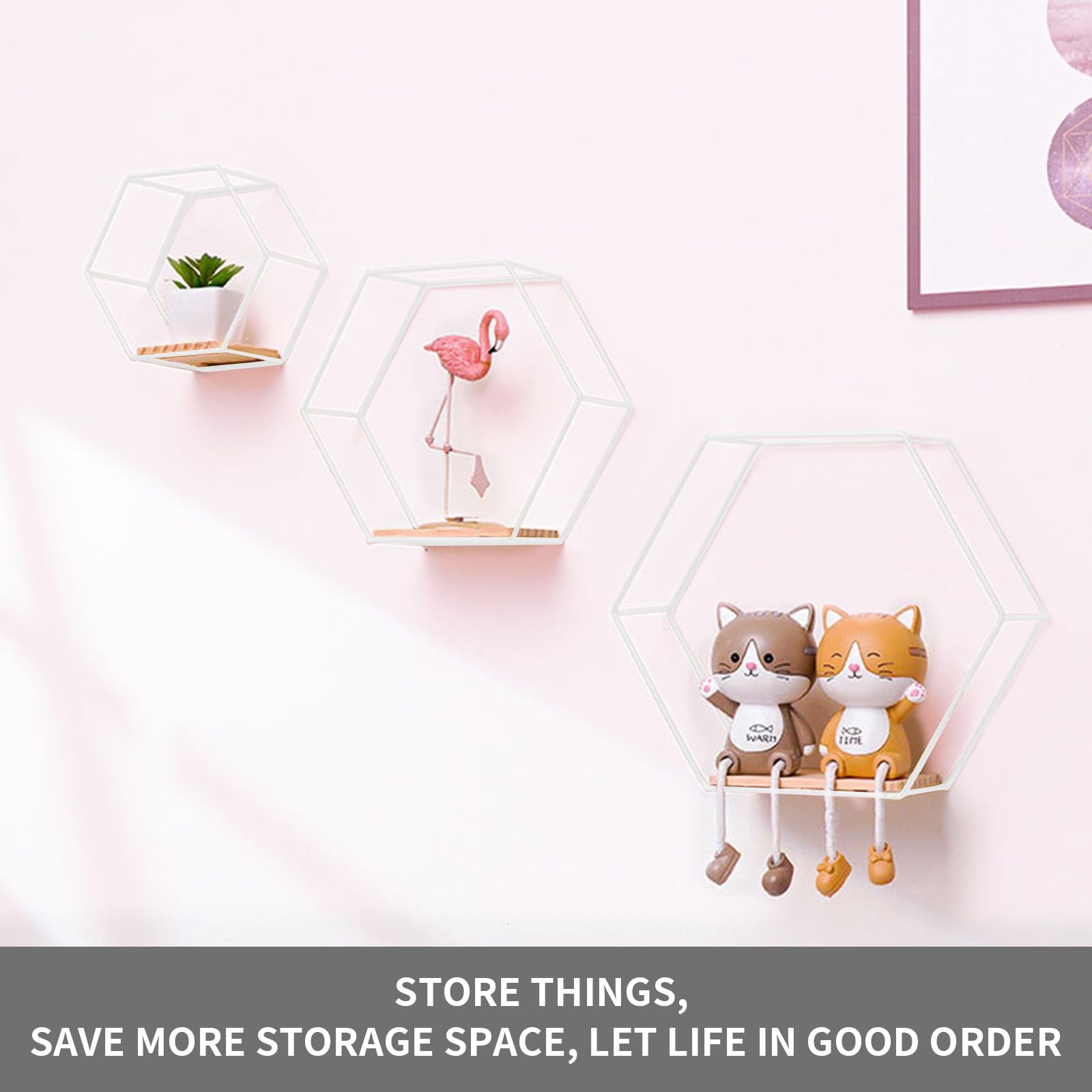 Hexagon wall shelf white metal 3 piece set, shelf wall decor hanging shelf loft wall shelves, wall shelf white for wall decor in living room, bedroom, bathroom, cafe, and hotel.