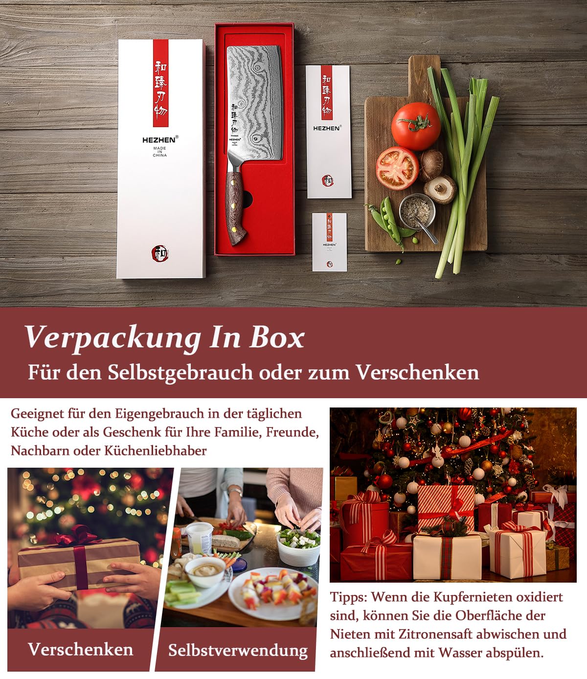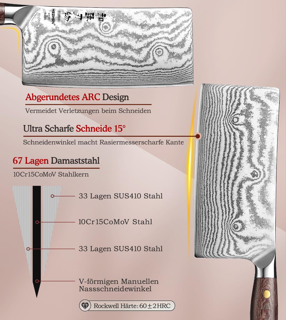 HEZHEN 18cm Cleaver, Professional Chinese Chef Knife, Damascus Steel Sharp Kitchen Knife, Vegetable Meat Cleaver Cutting Knife, Ergonomic Micarta Handle