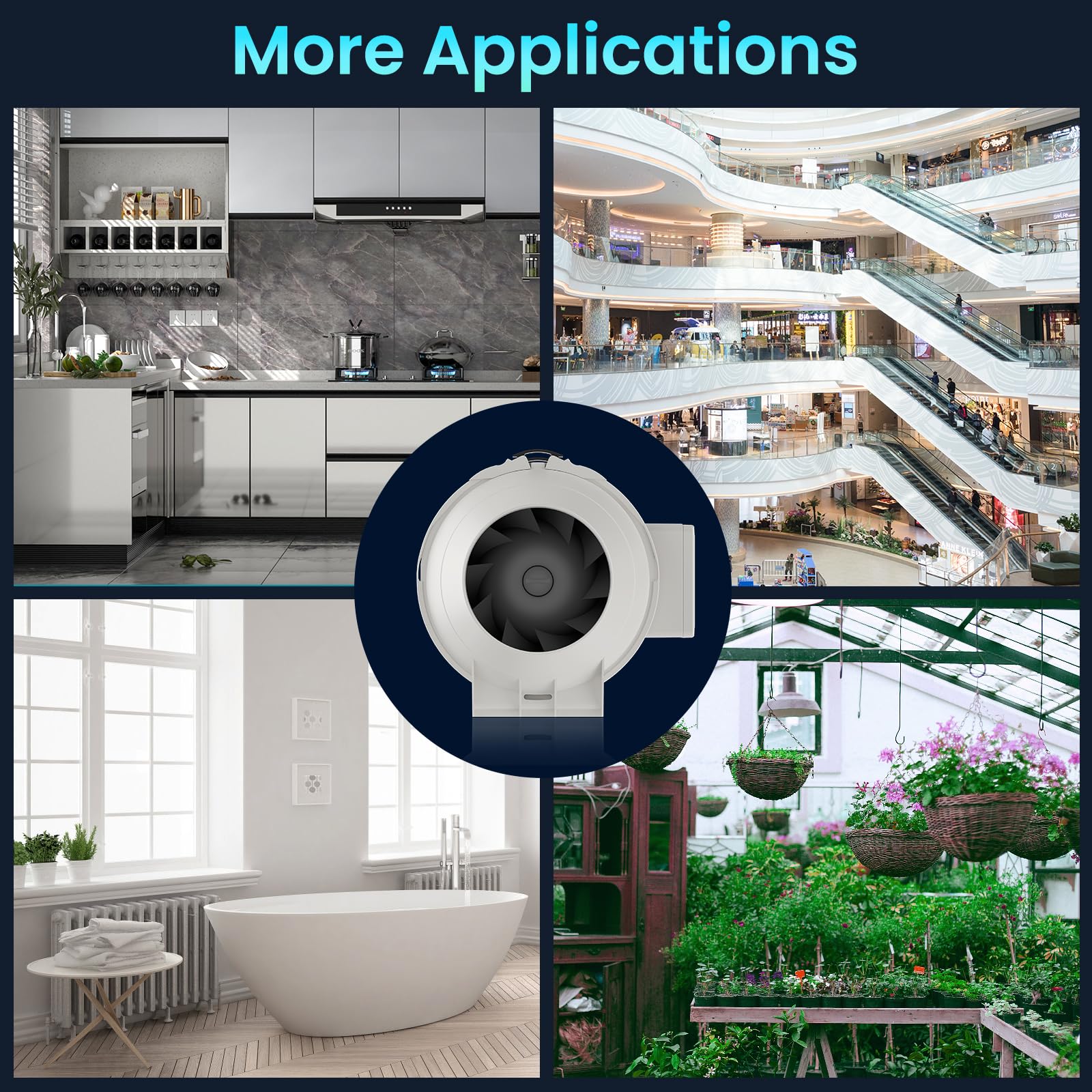 "Wide range of applications - Tube fan duct fan can be used with standard 125 mm or 5" rigid or flexible exhaust hoses. The products are used in conference rooms, high-quality office buildings, public spaces, hotels, apartments, basements, hospitals, gyms, and other places where ventilation is required."