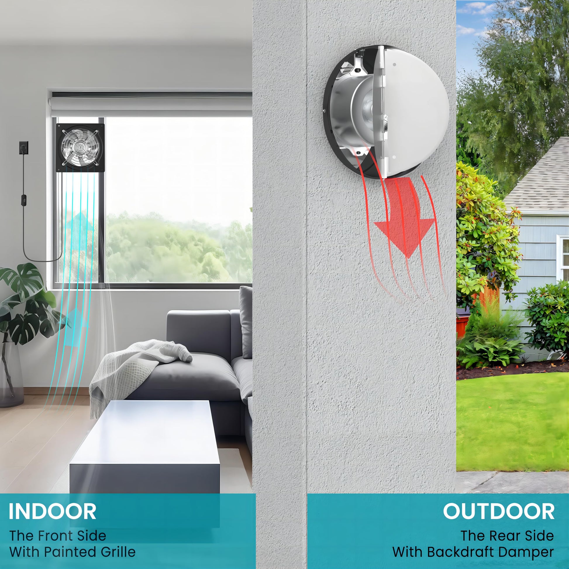 ["High-performance ventilation This exhaust fan features a durable copper motor. Its quiet and efficient exhaust function effectively eliminates odors and moisture.","Excellent quality The window fan is made of high-quality stainless steel and does not tend to deform. The check valve on the back opens or closes automatically with the airflow, effectively preventing insects, dust, and rodents from entering.","Technical specifications Diameter: 150 mm (6 inches); Power: 38W; Voltage: AC220V; Frequency: 50Hz; Air volume: 525 m³/h; Speed: 2800 RPM.","Versatile application Suitable for bathrooms, living rooms, bedrooms, kitchens, offices, and other spaces that require continuous or regular ventilation.","Easy installation Can be installed on the wall or ceiling (if installed on the ceiling, the check valve must be removed). The detachable design makes cleaning easier. It is recommended to regularly clean dust or oil residue inside the fan to extend its lifespan."]