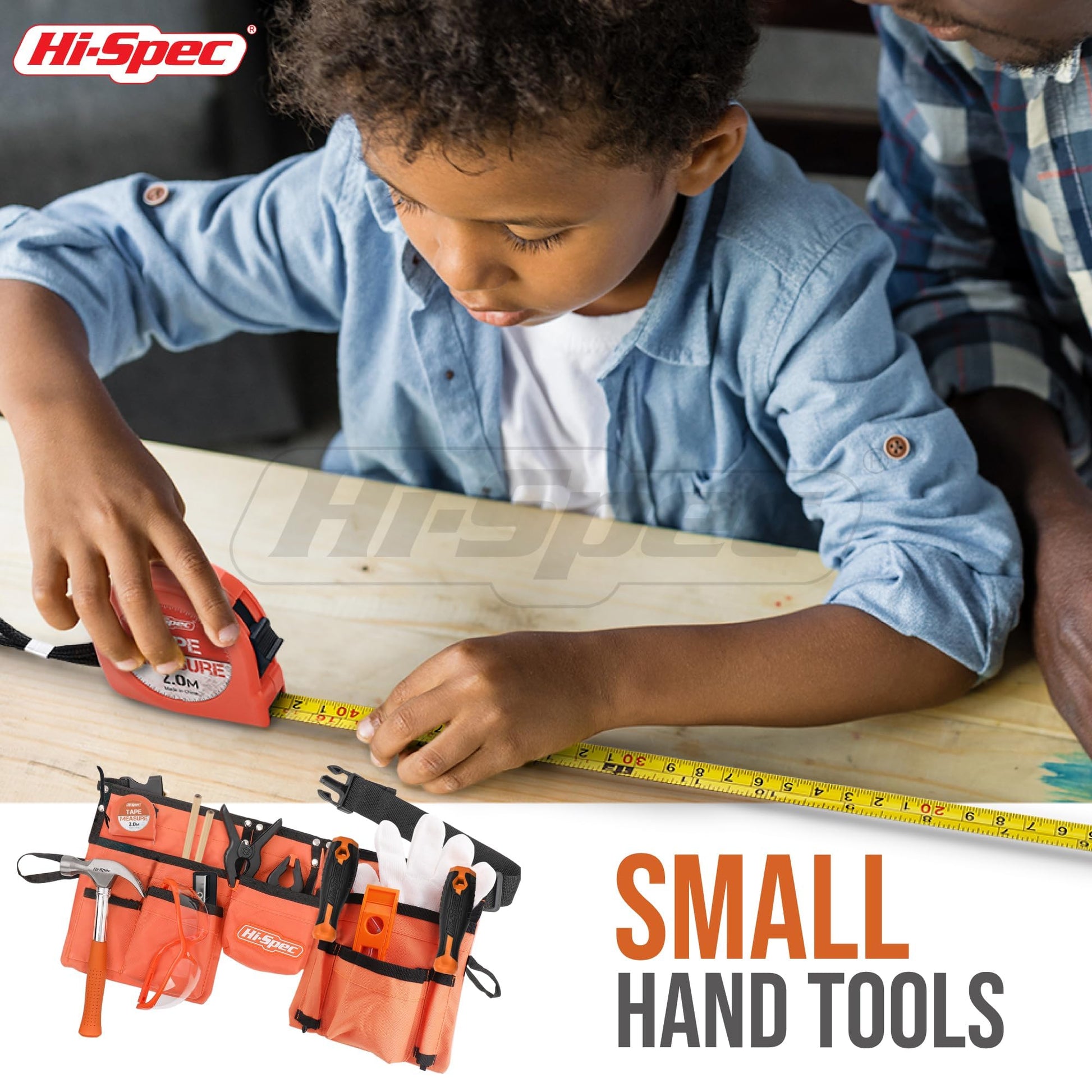 TOOL BELT: A sturdy 600D tool belt fits most children sizes (waist 22-27 inches) and provides ample space to keep tools within easy reach while working: 3 large pockets, 3 small pockets, pencil holder, and even a metal hammer loop.