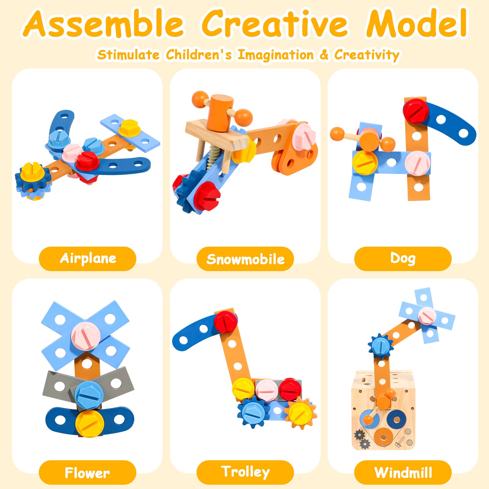 ["39 Piece Tool Kit for Kids Ages 2 and Up: Our children's tool set includes a wooden workbench (20.5x12.5x12.5cm), kids' apron, screwdriver, hammer, wood saw, wrench, handle, wooden block, gears, screws, nails, hex nuts, and other small accessories. The set is not only full of accessories, but also includes a beautifully patterned kids' apron that enhances the joy of role-playing for children. Great toy for 2-year-old boys and girls.","Workbench for Kids Ages 3-4 Years: This tool kit is perfect as a role-playing toy for children, boys, and girls aged 3-4 years. It helps children explore and learn how to use tools, and is great for motor skills and tool usage in getting things done. Montessori toy for 2-3-4-year-olds.","Safe Wooden Toy for 3 Years and Up: This children's tool is made of non-toxic and child-safe materials with a very smooth, burr-free surface that does not harm children's skin. Fun kids' toy for 2-3-4-year-olds.","Multifunctional Wooden Kids Tools: The wooden toy box can be used as a children's tool bench, storage box. The inverted wooden tool box can be seen as a tool table for young children, where kids can use kids tools; After playing, the toys can be stored in the wooden toy box, which is easy to take anywhere and helps children develop good storage habits.","Ideal Gift for Kids Ages 2-3-4 Years: This kids' workbench is a great birthday or holiday gift for intelligent and curious children who are always looking for more fun. Kids' toy for 3 years old. This interactive game is sure to brighten your child's day.","Warm Tips: If accessories are damaged or lost during use, please contact customer service. We recommend this toy for children over 3 years old, but if 2-year-old children also want to join in, please play under adult supervision."]