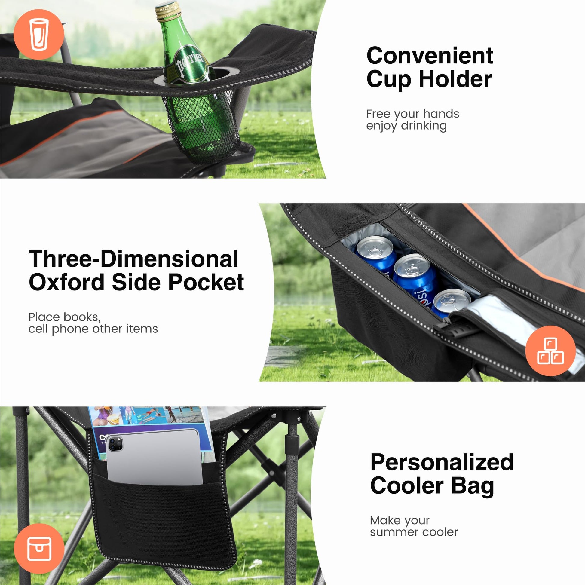 ["Oversized Camping Chair Dimensions: 37" x 25" x 39" (L*W*H), Weight approximately 13 lbs. The folding chair provides a wide seating area with 600 x 300 D padded Oxford fabric and padded armrests for comfort while camping.","Additional Storage Spaces: The outdoor chair's armrest includes a mesh cup holder, keeping your hands free. With the cooler bag and mesh cup holder design, you can stay cool in hot summers. Side pocket for phone, magazine, or map.","Camping Chair 440 lbs Capacity: The camping chair can support up to 440 lbs. Features corrosion-resistant and matte powder coating for durability. Four heavy-duty steel frame chair legs on the bottom. The sturdy steel frame construction can support up to 440 lbs, designed for long-lasting use. Enjoy it outdoors or in your garden all year round.","Portable, Foldable, and Comfortable: The foldable camping chair can be easily set up and folded in seconds. When folded, it measures 39" x 7" x 7" and weighs only 13 lbs. Perfect for home, camping, or travel.","Comfortable XXL Camping Chair: Our padded folding chair with thicker material and wide seats is comfortable. Ideal for fishing, carp fishing, outdoor activities, etc."]
