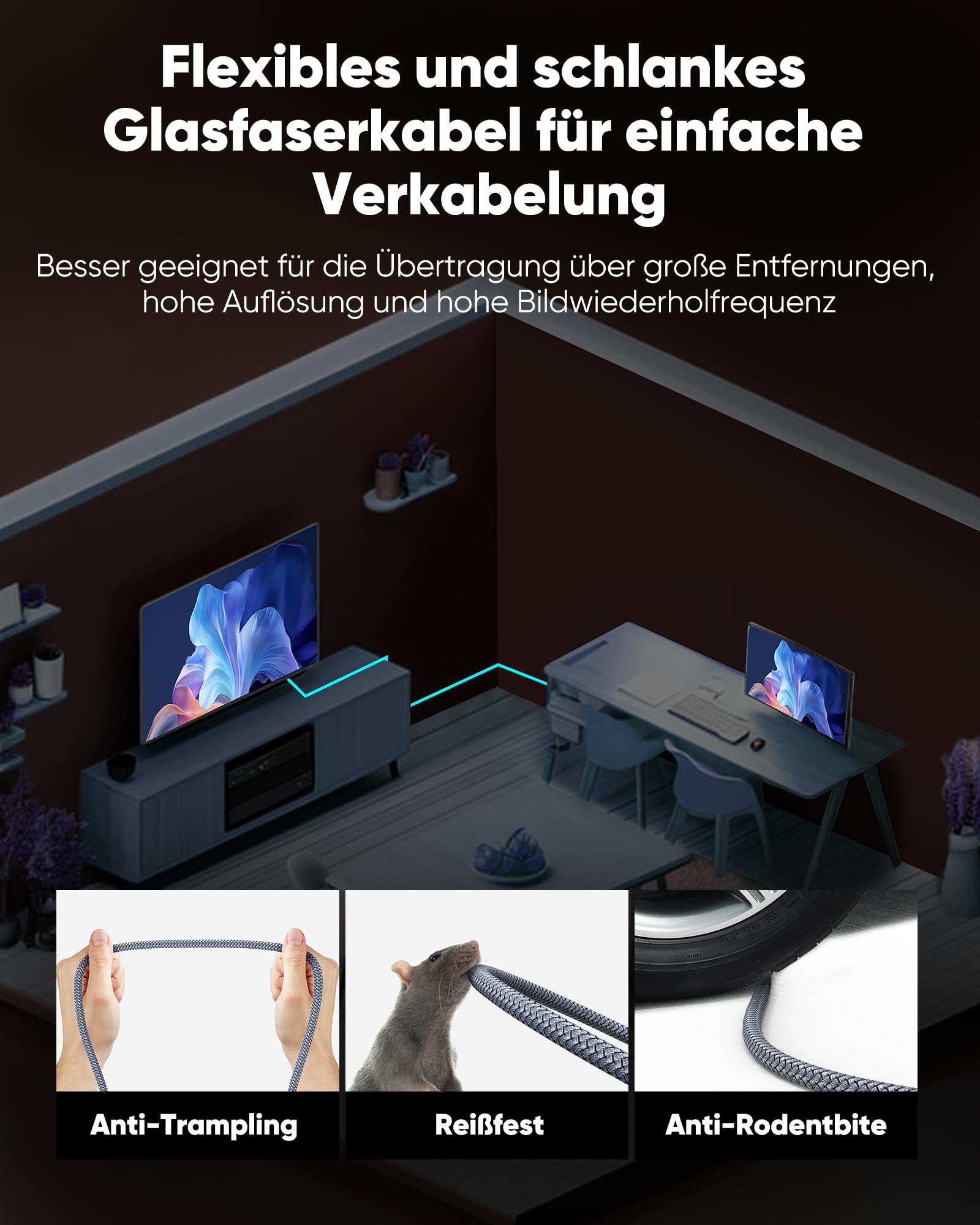 ["šćUltra High Speed 48Gbps HDMI 2.1ćHighwings 8K HDMI Cable 65.6 feet are compatible with HDMI 2.1 and backwards compatible with HDMI 2.0b/2.0/1.4/1.3/1.2/1.1. HDMI 2.1 Cable 65.6ft has a transmission speed of up to 48Gbps, which is 2.6 times faster than that of HDMI 2.0 (18Gbps), giving you a smoother and more stable video experience. This provides you with a smoother and more stable video experience, allowing you to say goodbye to frame jamming and frame losses while watching videos","šćTop Technology -- 8K@60HZ HDMI CablećThis 8K HDMI Cable 65.6 feet supports resolutions and refresh rates up to 8K@60Hz, 4K@120Hz. With 8K HDMI's unique Dynamic HDR and 12 Bit color processing and 48Gbps bandwidth, it delivers an 8K HDMI experience and 3D visuals with better depth, brightness, detail, contrast, and wider color gamut. Ultra HD movie experience and 3D display with better depth, brightness, detail, contrast, and wider color palette","šćOptimized for Gamers: HDMI 8KćHDMI 2.1 cable 65.6ft supports 8K resolution at 60Hz and 4K resolution at 120Hz/144Hz, providing you with a smooth, uninterrupted gaming experience. HDR also optimizes the darker images of the game and enhances details to deliver a sharper image. HDMI 2.1 also supports HDCP 2.2 and 2.3, ARC, eARC, ALLM, VRR, QMS, QFT, DTS: X, and 3D video display","šćSuperior HDMI 2.1 DesignćHighwings 8K HDMI Cable 65.6 feet, made of fiber optic cables, to transmit stable video and audio signals. The high-quality aluminum casing provides better heat insulation. The strain relief design under the aluminum casing offers you additional protection against damage. 24K gold-plated connectors ensure signal stability. The nylon braided cable offers you a durable HDMI cable","šćReliable Quality ServicećYou will receive an 8K HDMI 2.1 Cable 65.6 feet. We strive for thoughtful design and reliable quality and insist on reliable after-sales support. If you have any questions, you can contact us at any time and we will address your questions and concerns","šćSleek & Robust Fiber MasterpiecećWith state-of-the-art fiber optic technology, this product sets new standards for cable standards: Compared to traditional copper cores, it offers greater bandwidth, faster transmission speeds, lower signal losses, superior interference resistance, longer service life, and higher data capacity - all in an exceptionally slim and lightweight design","šćImportant Installation TipsćThis product is a fiber optic HDMI cable, where you need to pay attention to the direction of the connection. Both ends of the cable interface are labeled with [SOURCE] and [DISPLAY]: The SOURCE end should be connected to the playback device (e.g. laptops/gaming consoles/Blu-ray players, etc.); the DISPLAY end should be connected to the display device (e.g. TV/monitor/projector, etc.). Make sure you connect the cable in the correct direction (no signal will be output if connected in reverse)","fiber optic cable, HDMI Cable 2.1 fiber optic, optical HDMI cable 65.6 feet, fiber optic HDMI cable 65.6 feet, HDMI cable 65.6 feet, HDMI cable 65.6ft, HDMI 65.6 feet, HDMI 65.6ft, HDMI 2.1 cable 65.6ft, HDMI 2.1 cable 65.6 feet, HDMI cable 65.6ft, HDMI cable 65.6ft"]
