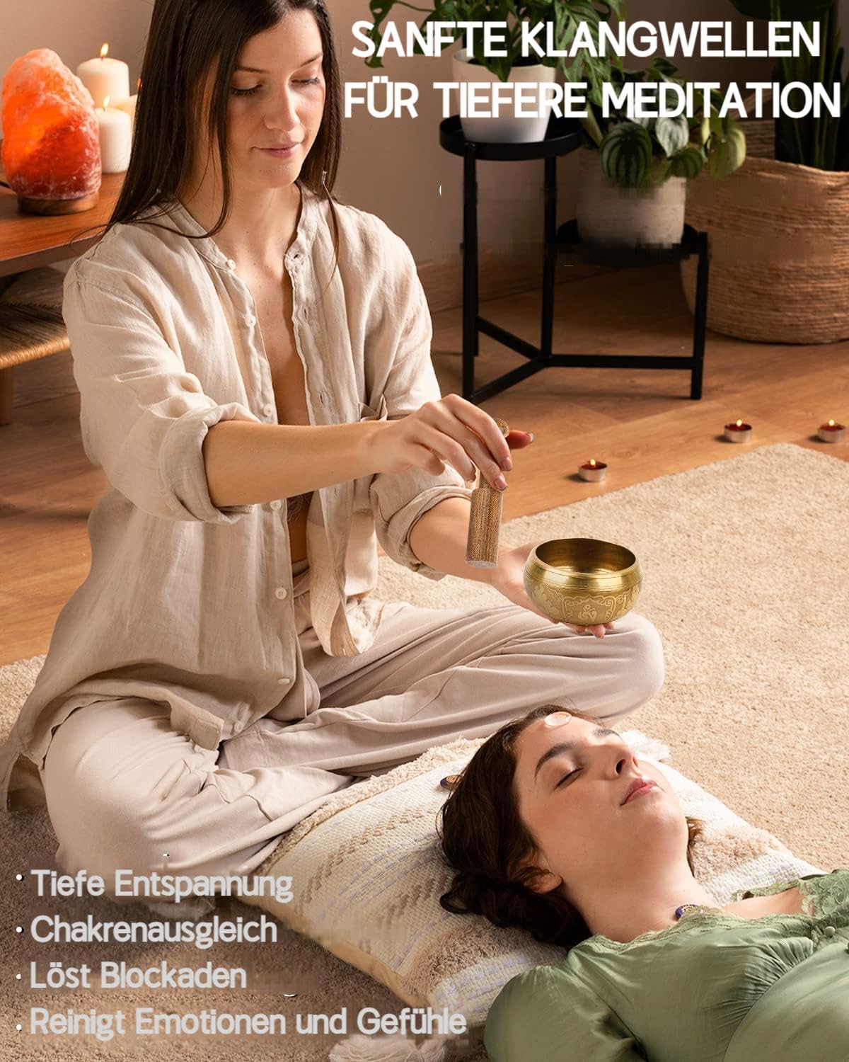 ["Tibetan Singing Bowl Set: Yoga singing bowl with 12 cm diameter made of solid copper; includes wooden mallet, decorative ring cushion, and gift box; 100% handmade in Nepal","Wonderful Tones & Beautiful Design: Produces soothing, long-lasting tones; playing with the wooden mallet creates relaxing sounds for deep relaxation","Versatile Use: Ideal for yoga, meditation, relaxation, self-care, massage rooms, wellness, healing, sound therapy, mindfulness, and spiritual decoration","Easy to Learn and Play: Easy to play, even for beginners; can be used as a gong; great for music teachers","Unique Gifts For Women: Perfect for beginners and professionals; ideal gift for birthdays, Christmas, graduations, and as meditation accessories"]