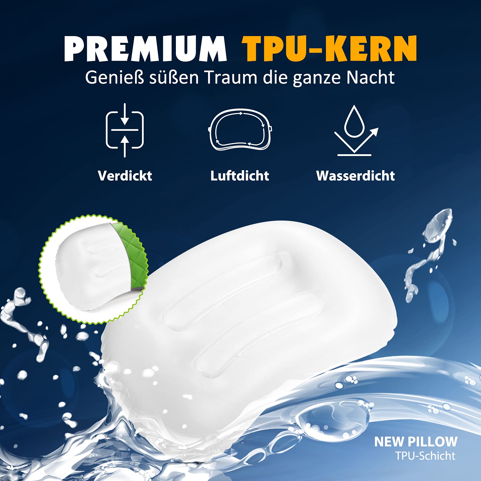 ["🌟⛺ SCHÖNE TRAUME UNTER STERNEN - Aufblasbares Kopfkissen mit bequemem und weichem Kissenbezug, damit du beim Campen oder im Biwak wie Zuhause schläfst. Das praktische Camping Kissen isoliert beim Übernachten im Zelt gegen die Kälte, die vom Boden aufsteigt, und sorgt für hohen Schlafkomfort beim Übernachten im Zelt oder unter den Sternen nach einem langen Wandertag."]