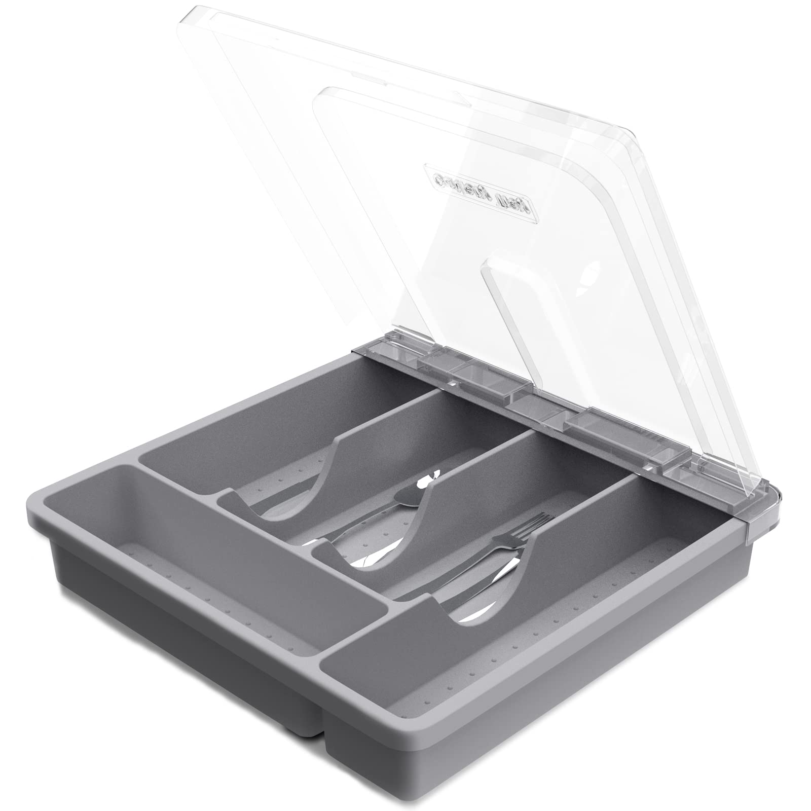 HIMAugbo cutlery box with lid, cutlery box for camping, plastic cutlery storage sorting tray for countertop/travel/kitchen board 30 x 30 x 7 cm, gray