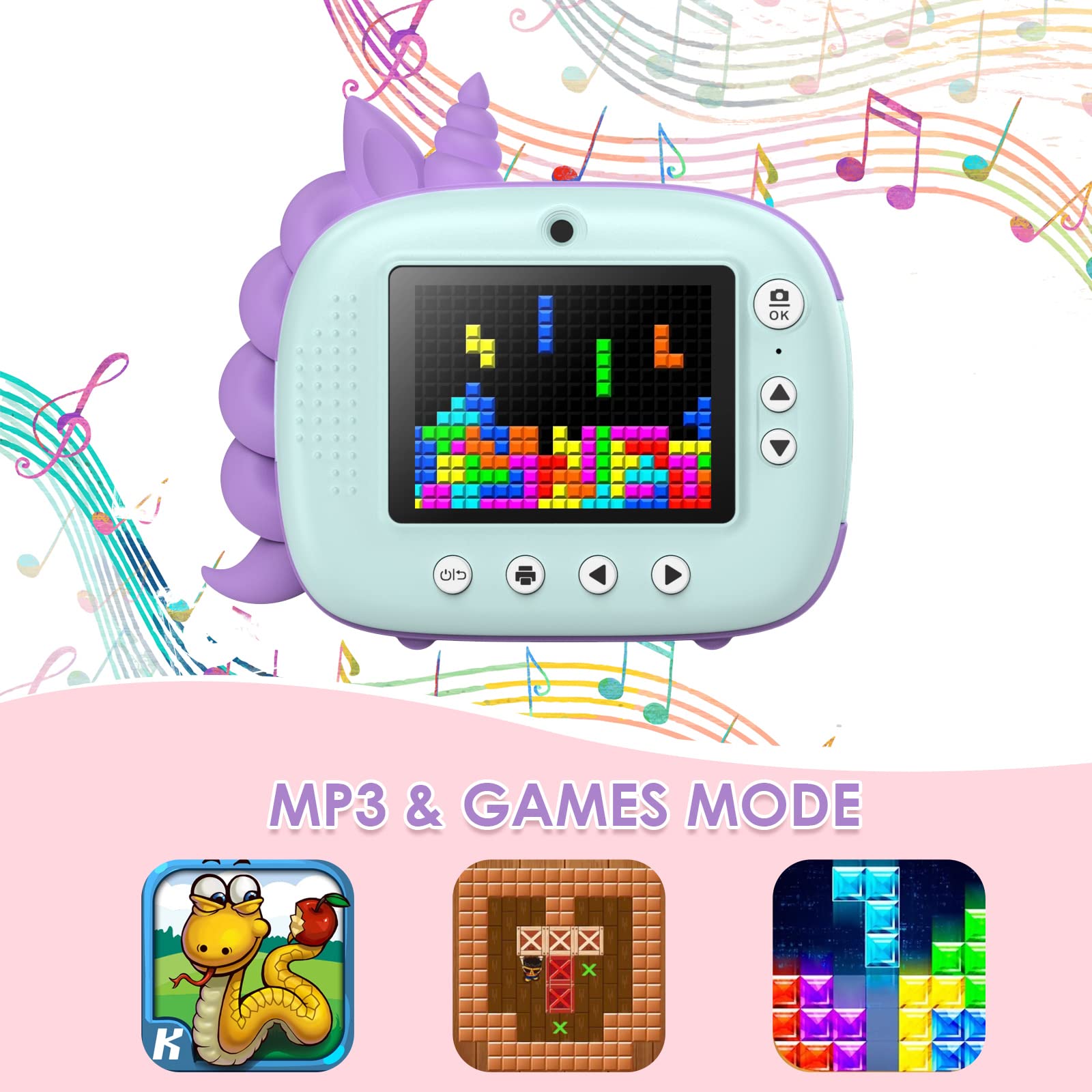 ["MULTIFUNCTIONAL AND USER-FRIENDLY"] This children's camera has 6 functions, such as color photography, high-resolution videos, black and white printing, music, playback, and games, allowing your children to easily operate it and have fun. To better capture every meaningful moment of your child's childhood, the camera also features 6 different color filters, 20 different cartoon photo frames and characters, etc., and enables continuous shooting, timer shooting.