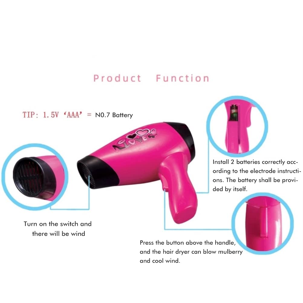 ["Strong playability, let children learn about hairdressers and makeup while increasing child interaction","Equipped with multiple accessories, you can dress up like you. And the hair dryer requires 2 AAA batteries.","Durable plastic material, strong and not easily damaged.","Application: playhouse, makeup, and costume.","A variety of doll shapes, each size is 20 x 18.3 x 8.5 cm."]